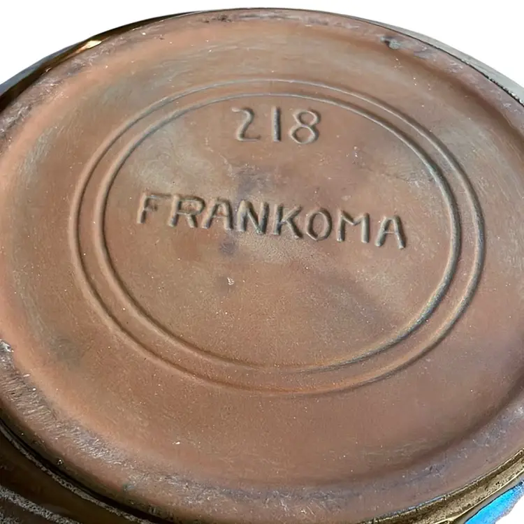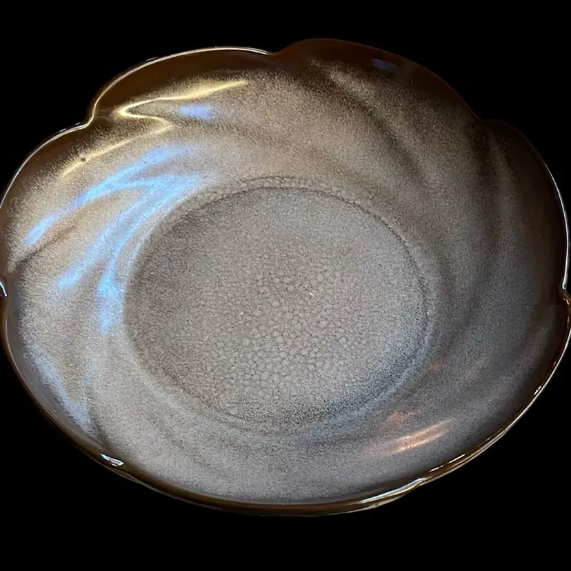 This is a vintage Frankoma 11" Scallop Bowl, model number 218. It is made from local Sapulpa red clay in Oklahoma. The glaze appears to be Prairie Brown or Desert Gold, popular Frankoma colors. It features a scalloped rim design. Frankoma pottery is known for its durable, break-resistant, and dishwasher-safe earthenware.