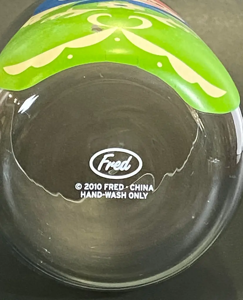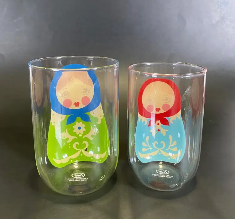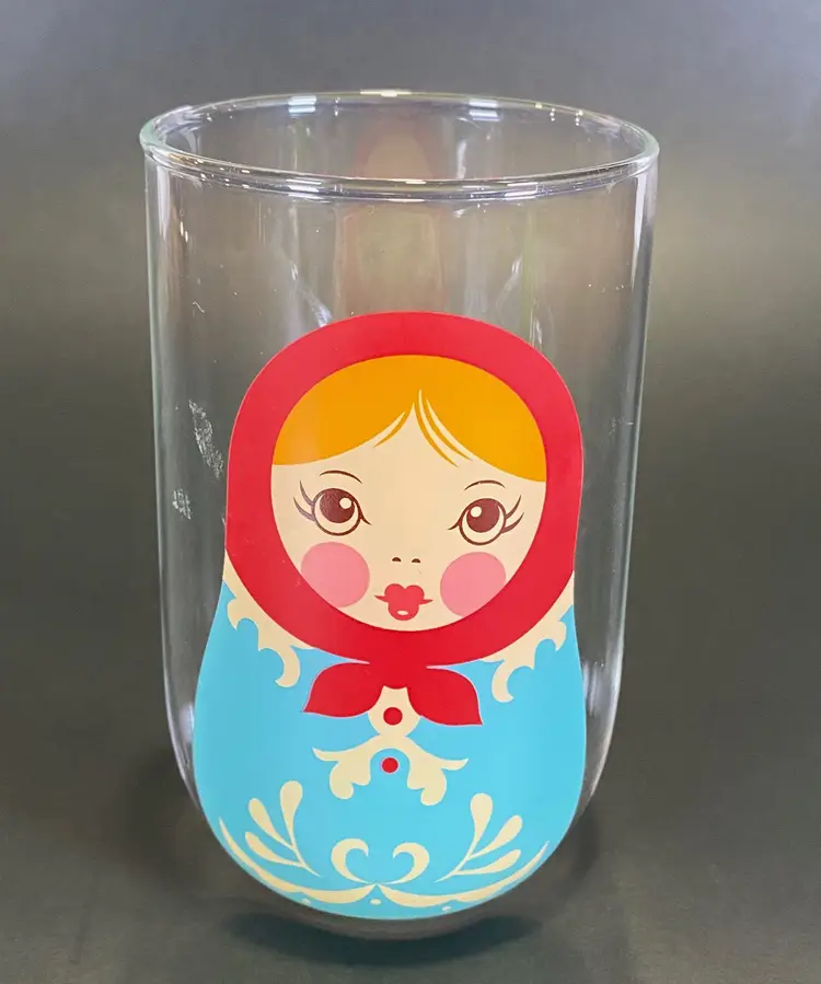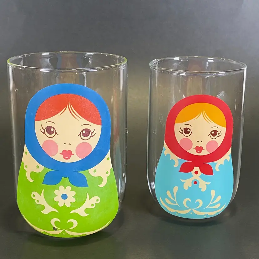 New & Unused set of 2 Russian hand-blown "BABUSHKUPS" glass tumblers in different sizes, 14 and 10 ounces. They can nest within one another for space-saving storage. The glasses are decorated with colorful matryoshka characters. Made by Fred & Friends vintage 2010. These are new out-of-box in excellent condition. Bring some folkloric fun and personality to your home kitchen or bar with these charming Babushkups.