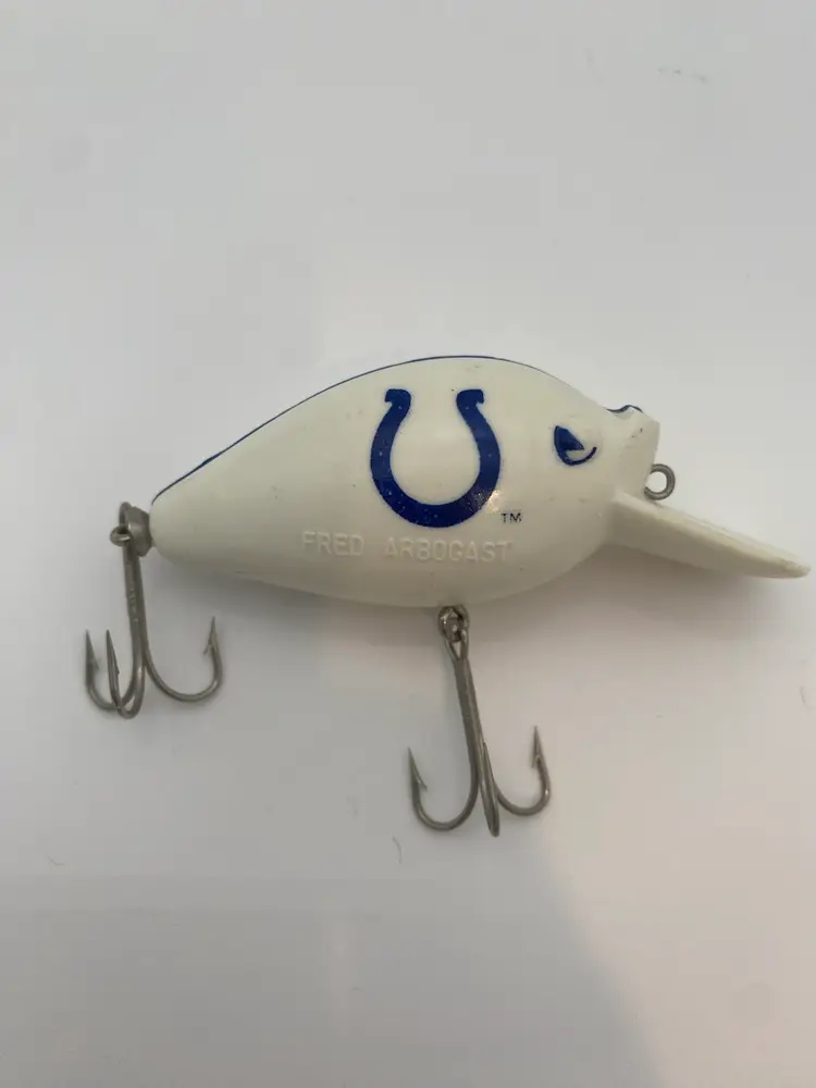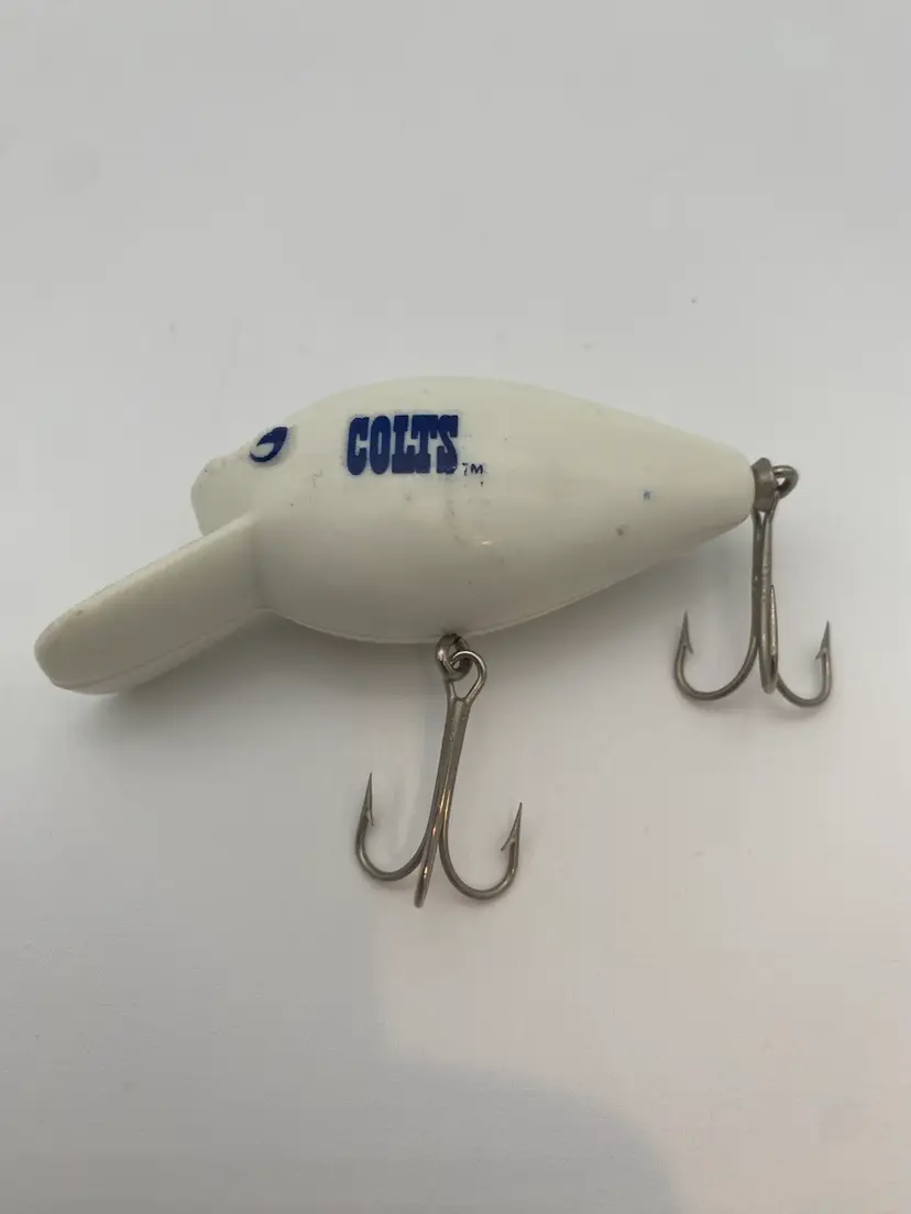 You are purchasing one vintage Plastic White & Blue NFL Indianapolis Colts Fishing Lure by Fred Arbogast. This Lure is around 3 inches in length. This Lure is in good condition with no chips or cracks in the material. No rusting, bending or dullness on the Hooks. No fading of the imaging. Minimal signs of wear.