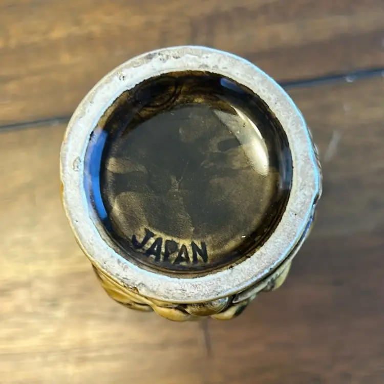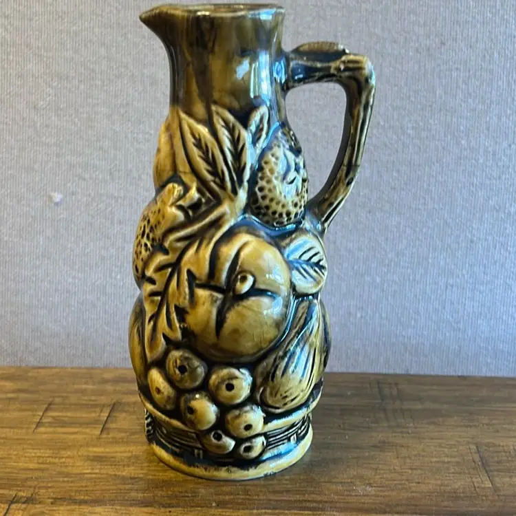 This brown vinegar bottle has white flowers and was made in Japan. There is a chip on the bottom of the spout, see picture. It is about 5 inches in hight.