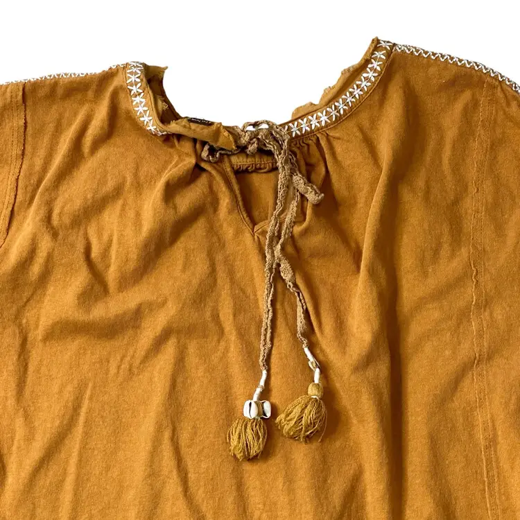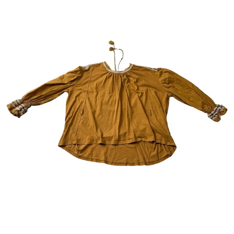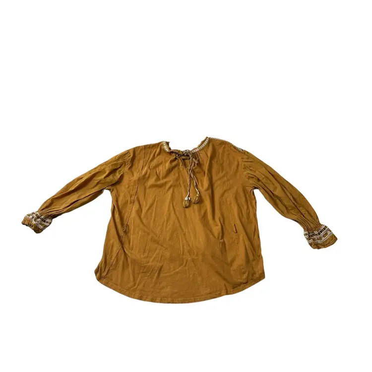 Free People Burnt Orange Boho Peasant Top Long Sleeve Embroidery Small Oversized small can fit medium no problem probably a large as well cute tassel details and comes with a tassel belt - boho, bohemian, free spirit southwestern vibe Great condition no flaws Ruffle sleeves, cutout designs, embroidery stitching 100% Cotton Chest: 54 inches Length: 26 inches
