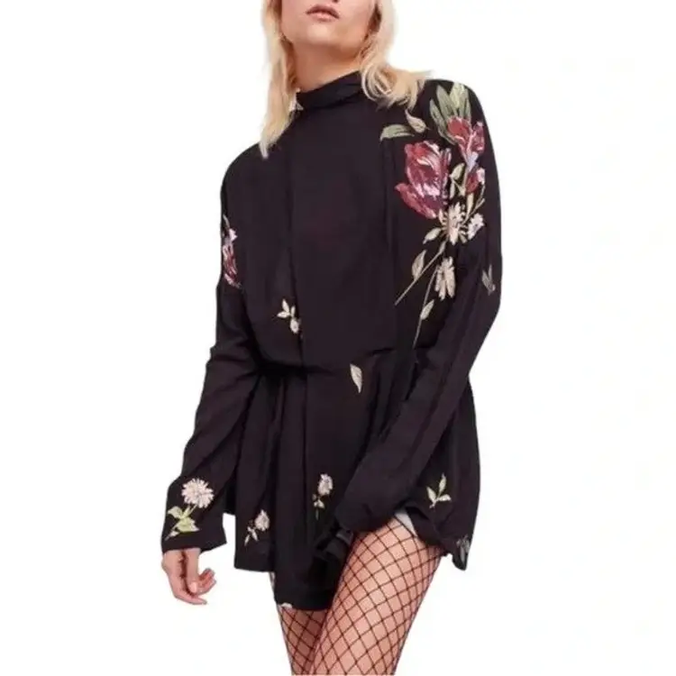 Femme floral tunic featuring a high neckline with an open back design. Absolutely beautiful statement making cocktail dress! The flattering and vibrant colors mixed with the retro drop waist, low open back, mock neckline and spectacular tie closure makes this dress one for the books! You’re sure to turn heads and get compliments with this unique mini!