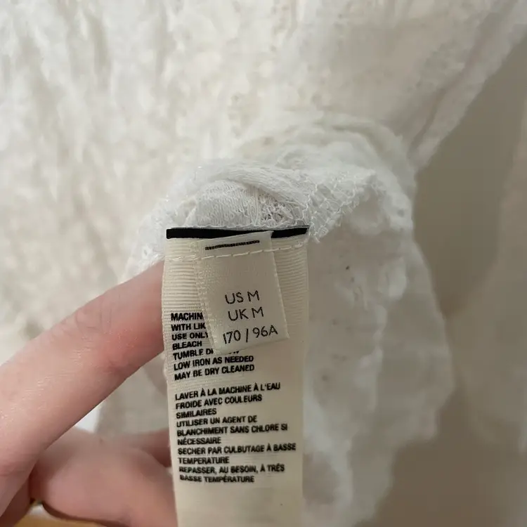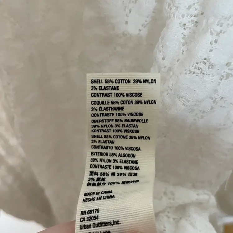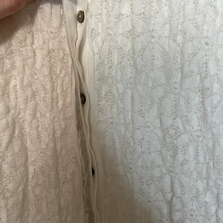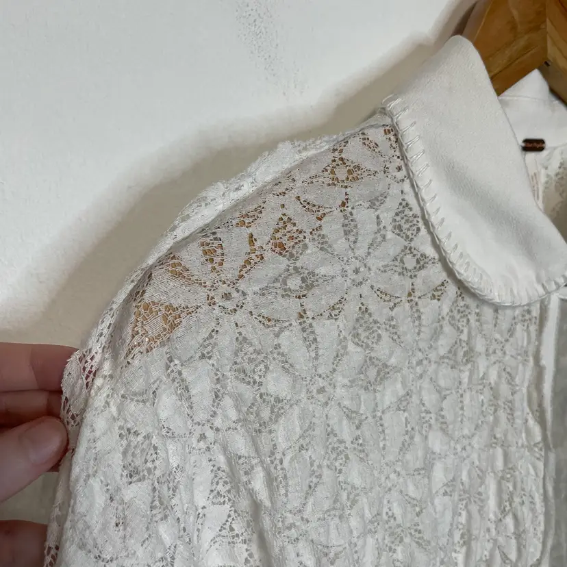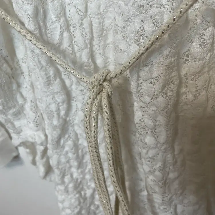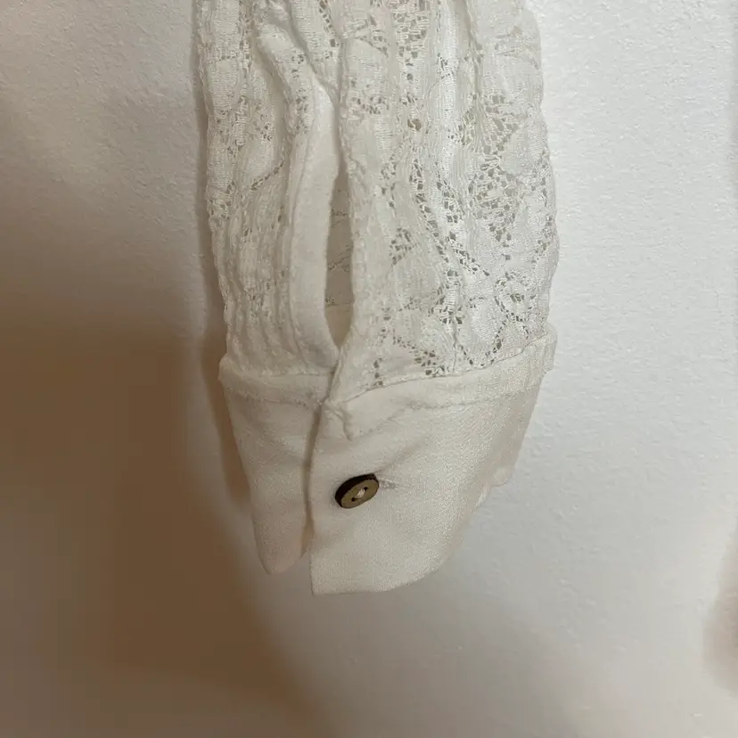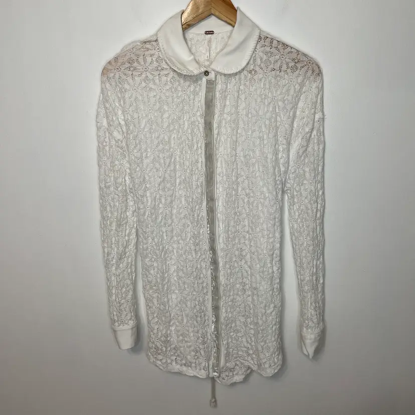 Free People Womens White Lace Long Sleeve Sheer Collared Velour Hidden Button Front Shoulder Ruffle Tie Back Tunic Top No FLaws of Note 58% Cotton 39% Nylon 3% Elastane Size M Approx. Measurements: Pit to Pit: 25.5 Inches Length: 31-32 Inches