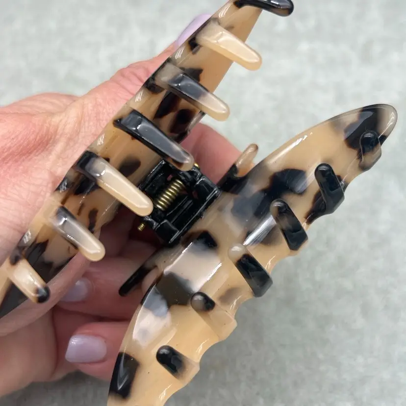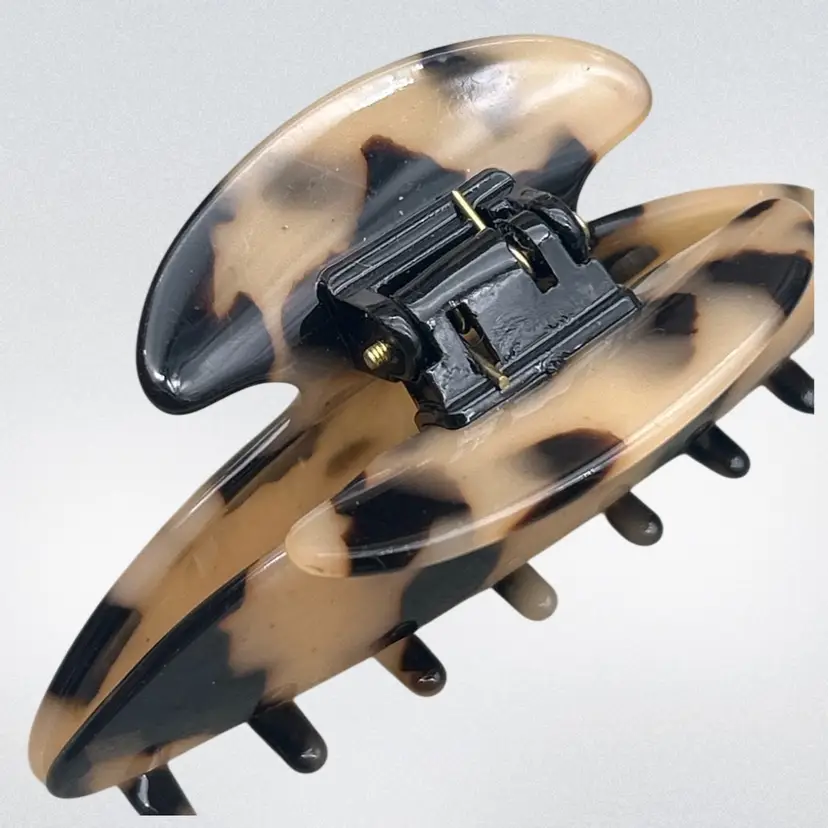 Notable Details • Made in France 🇫🇷 • French atelier / boutique-quality piece • Neutral tortoiseshell pattern (cream, beige, dark brown) • High-polish, glossy acrylic finish • Strong metal spring hinge for secure hold • Smooth, rounded teeth to protect hair • Ideal for medium to thick hair types • Classic, elevated everyday accessory