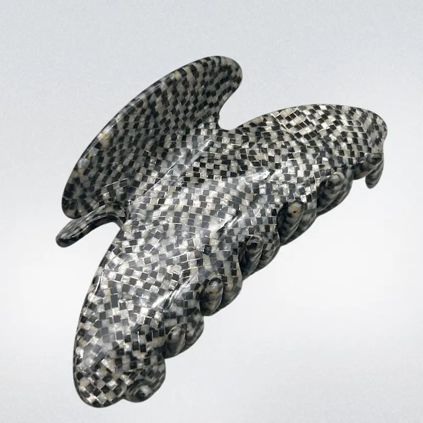 Make a statement with this high-end French atelier hair claw clip, expertly crafted in France from premium acrylic. Featuring a distinctive woven or checkered-style pattern in soft neutrals of gray, ivory, and black, this piece mimics the look of textured fabric while maintaining a sleek, glossy finish.