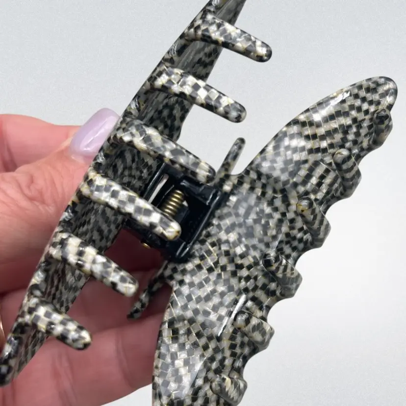 Details • Type: Hair claw clip • Material: Acrylic/acetate with metal spring • Color: Gray, black, ivory pattern