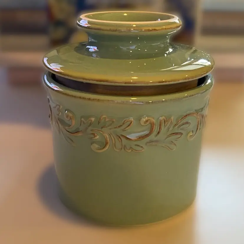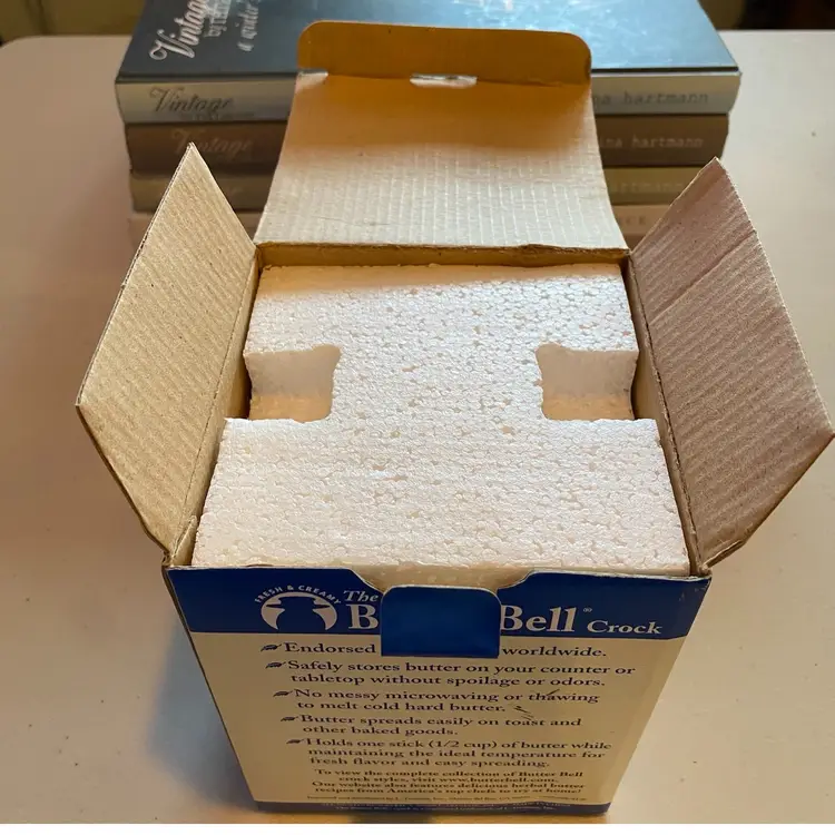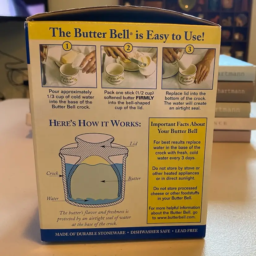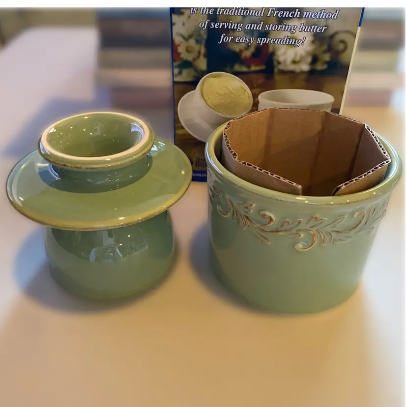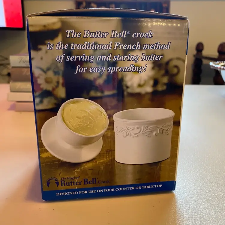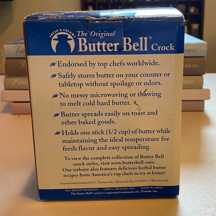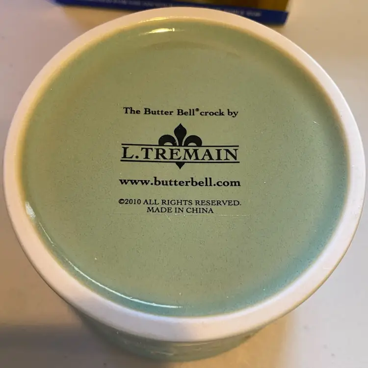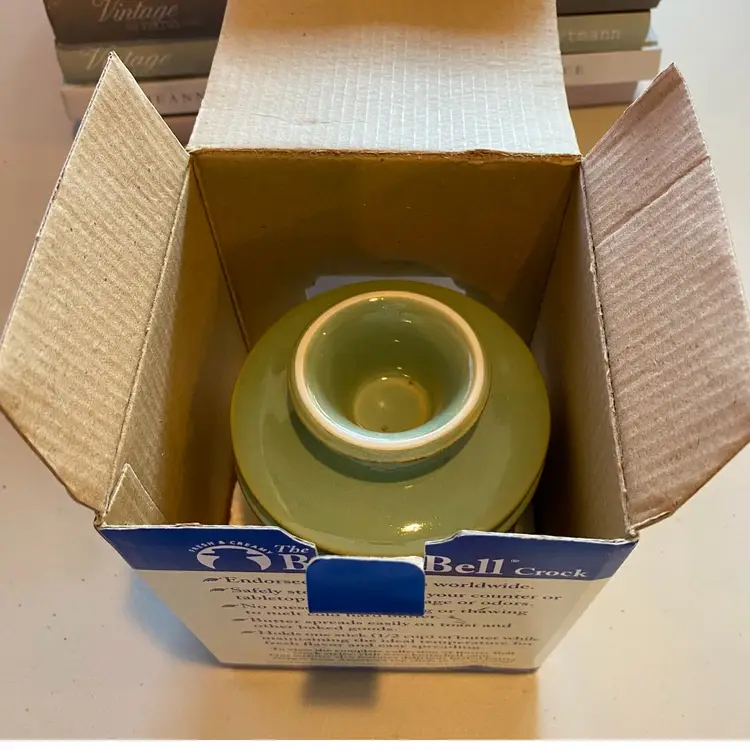 This 2009 French stoneware butter bell "The Original Butter Bell Crock" is new in box and the color is antique sea spray.