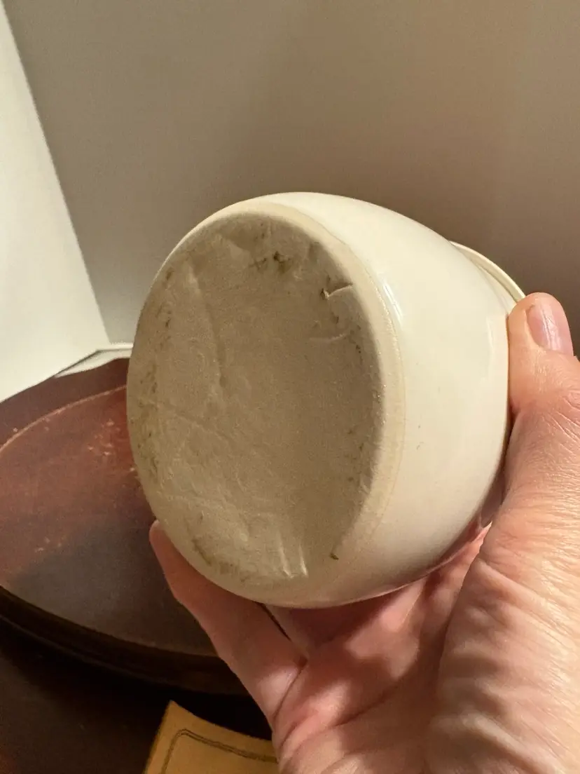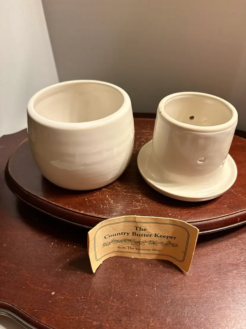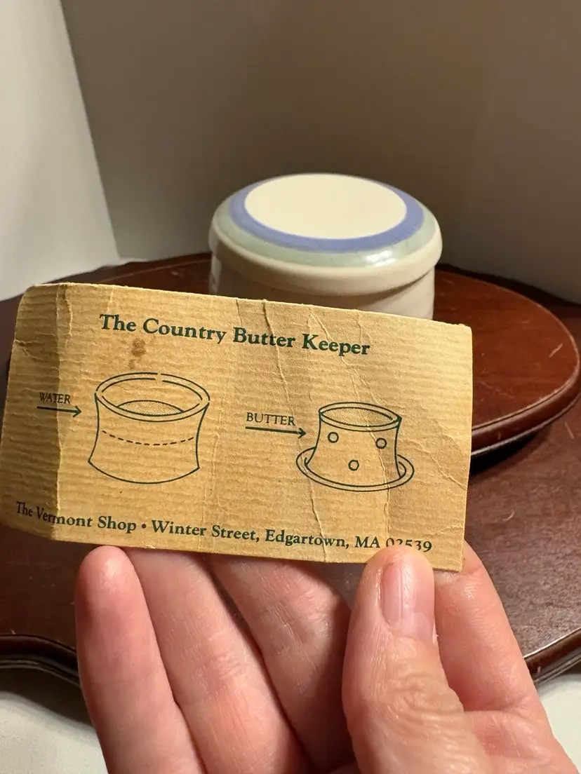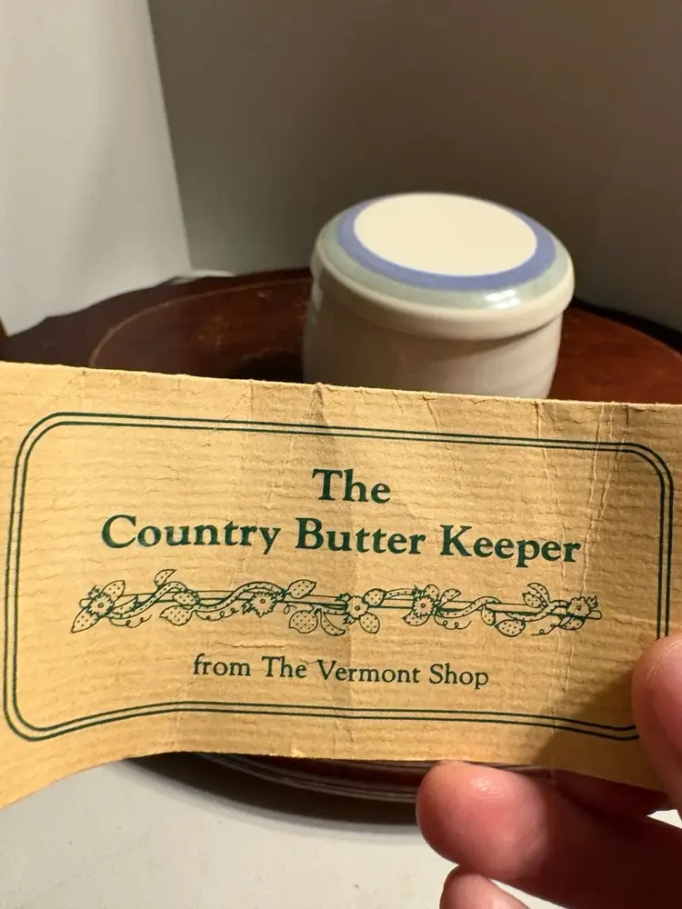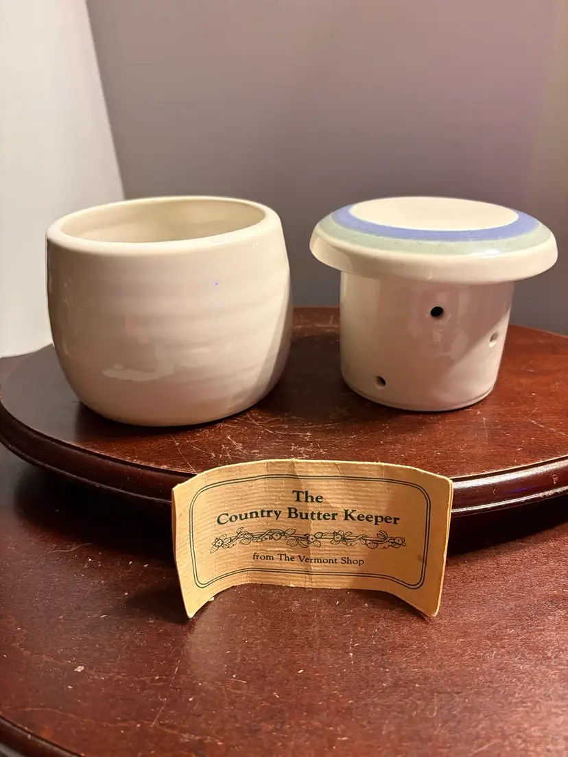 Creamy white with blue and green stripes, original directions included, made in USA, roughly 3.75” tall and 5” wide