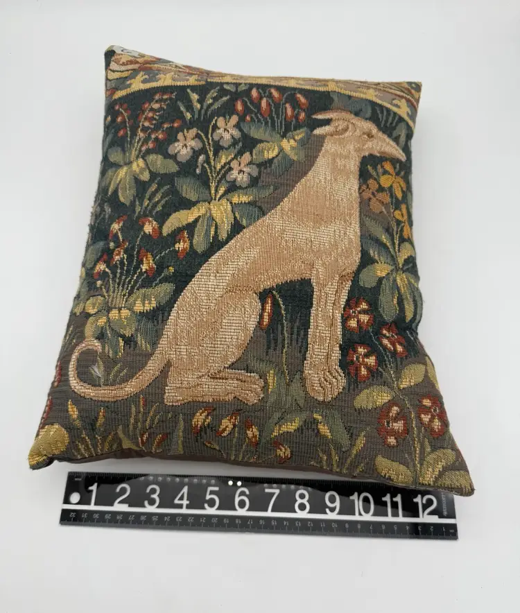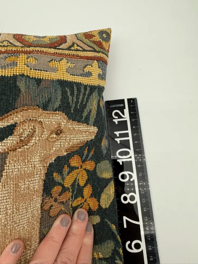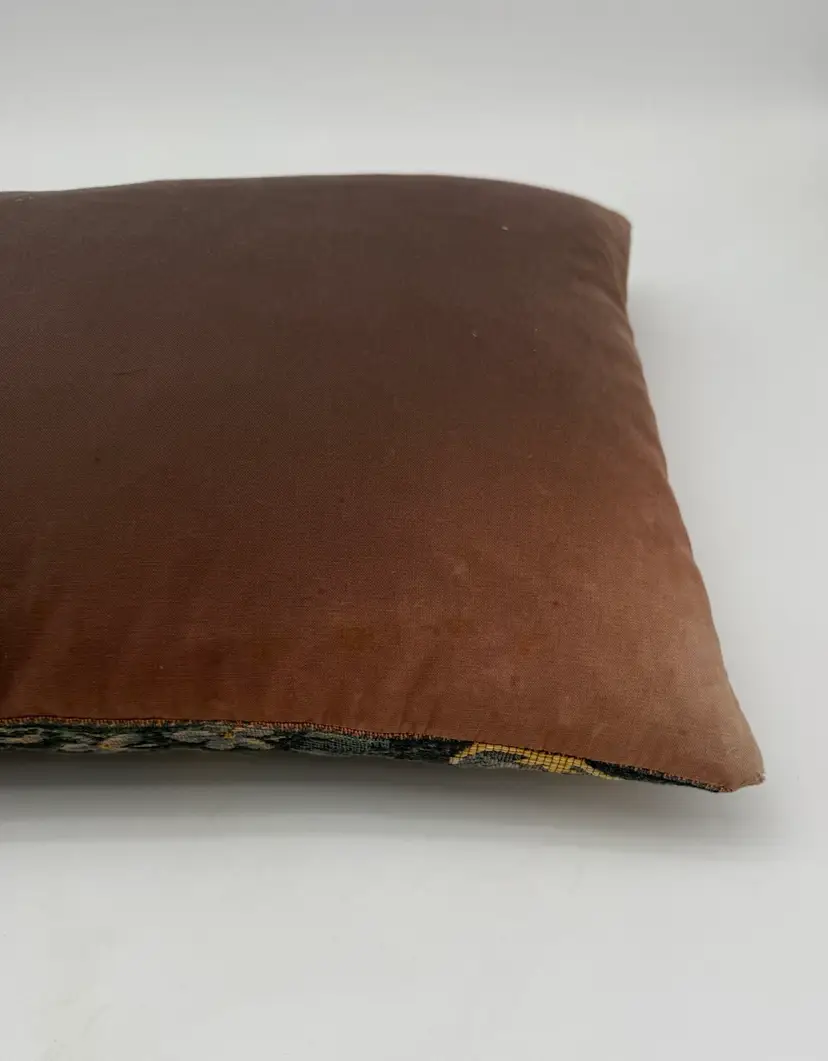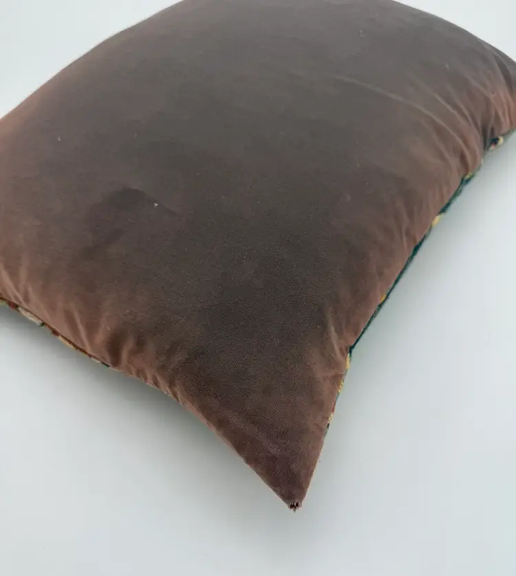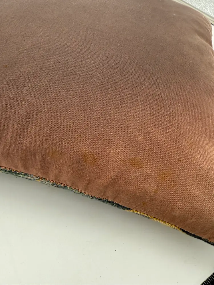 This is a beautiful pillow. Down filled. There is a small stain on the back and a little fading. Please ask all questions before buying. Thanks!