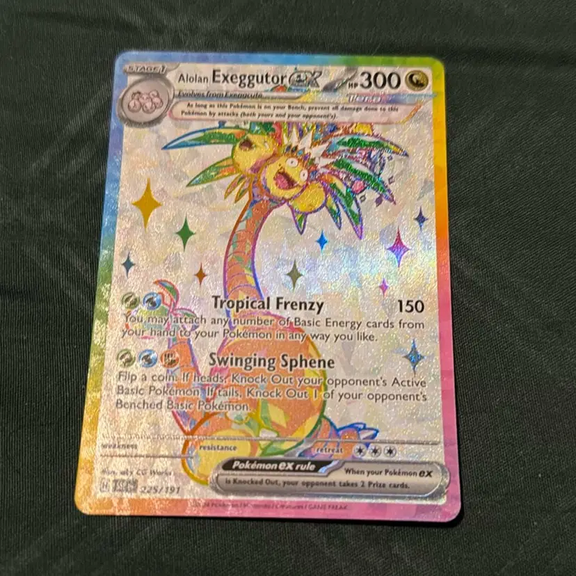 For sale is an Alolan Exeggutor ex Hyper Rare (Rainbow) from the Pokémon Scarlet & Violet – Surging Sparks set. Card Details: Pokémon: Alolan Exeggutor ex Set: Surging Sparks (SV) Card Number: 225/191 Rarity: Hyper Rare / Rainbow HP: 300 Condition: Near Mint (NM) – see photos for exact condition Language: English Highlights: Stunning rainbow foil with full-art design Secret Hyper Rare card beyond the standard set numbering Strong collector appeal and great binder display card This listing is for the exact card shown in the photos. Card will be shipped safely and securely