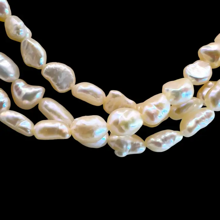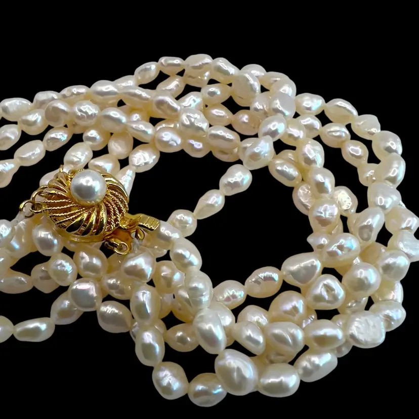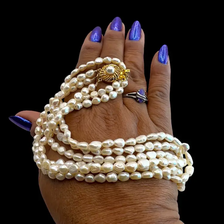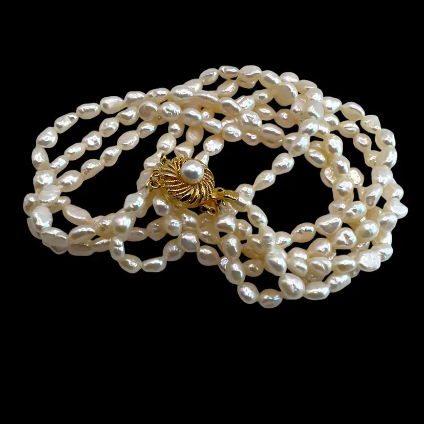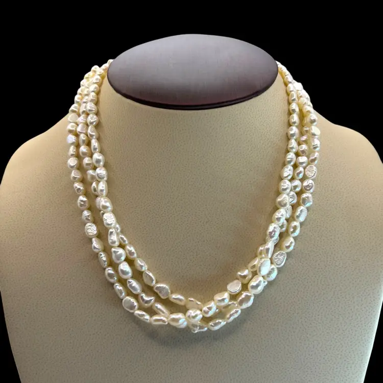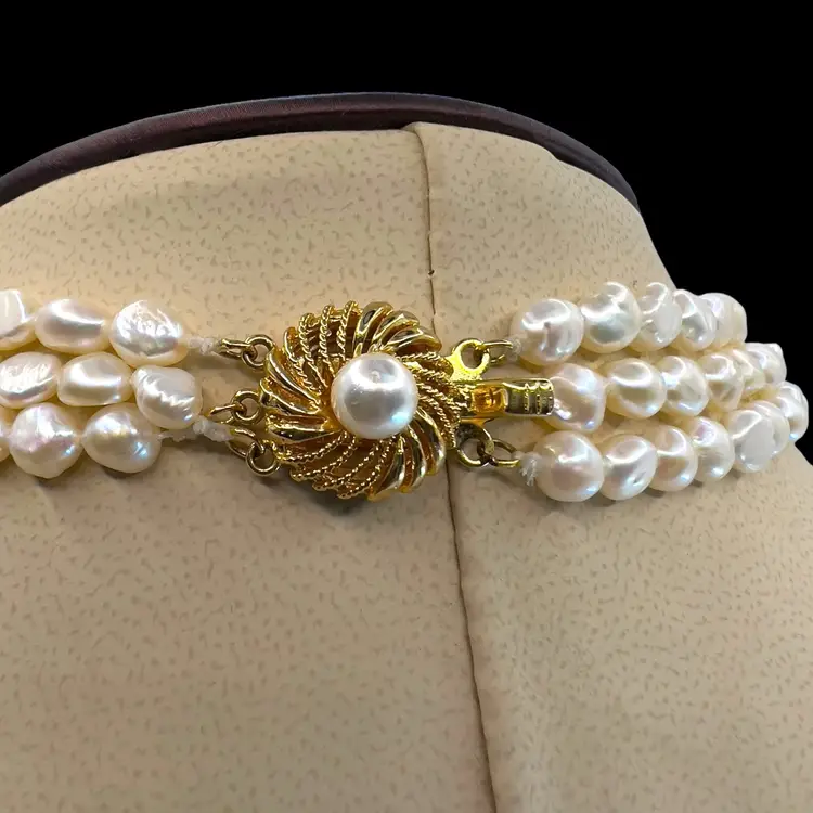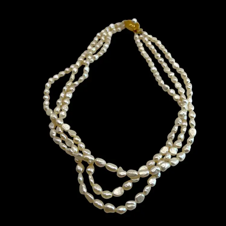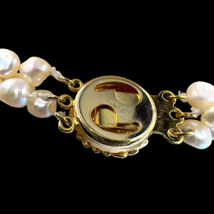 3 strands of fresh water pearls in beautiful condition. Vermeil slide clasp stamped “SILVER” Length is 17 inches.