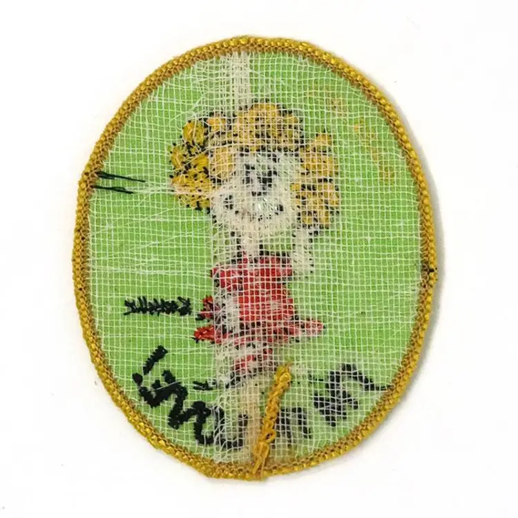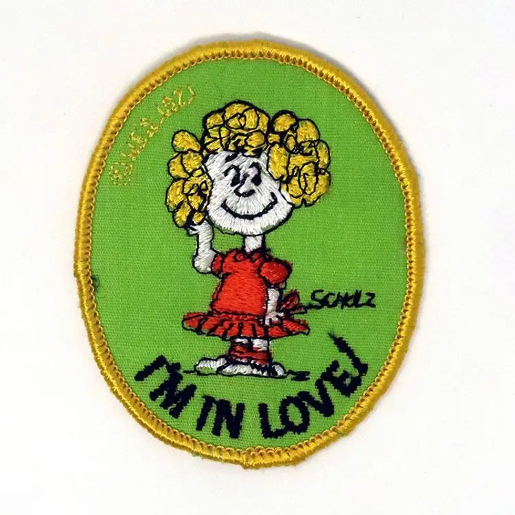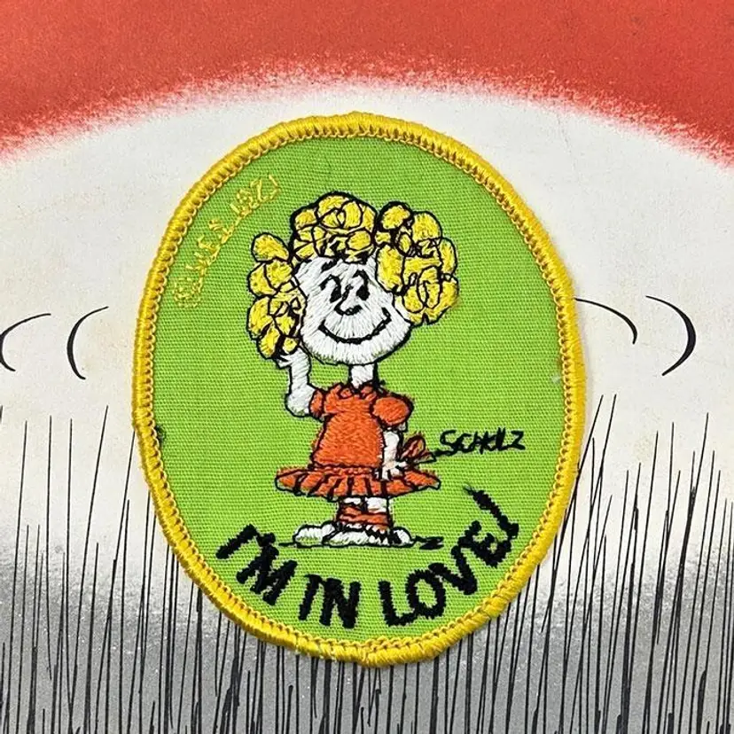Show off your Peanuts pride with this charming Frieda 'I'm in Love' embroidered patch. Featuring Frieda in a bright red dress and a cheerful expression, this patch is perfect for adding a touch of Peanuts flair to your jacket, backpack, or collection. A delightful piece for any fan of Charles Schulz's beloved characters. From Interstate Brands Company in 1971. In unused, like new condition.