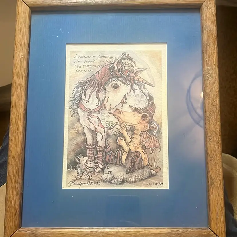 This item is a vintage framed lithograph print by artist Jody Bergsma, featuring a unicorn and a dragon. Dated back from 1983. It is a signed and numbered 2958 of 7500. 11 inches long and 9 inches wide.