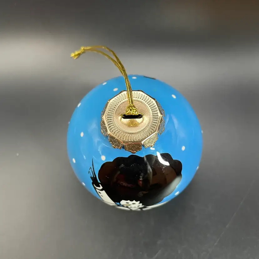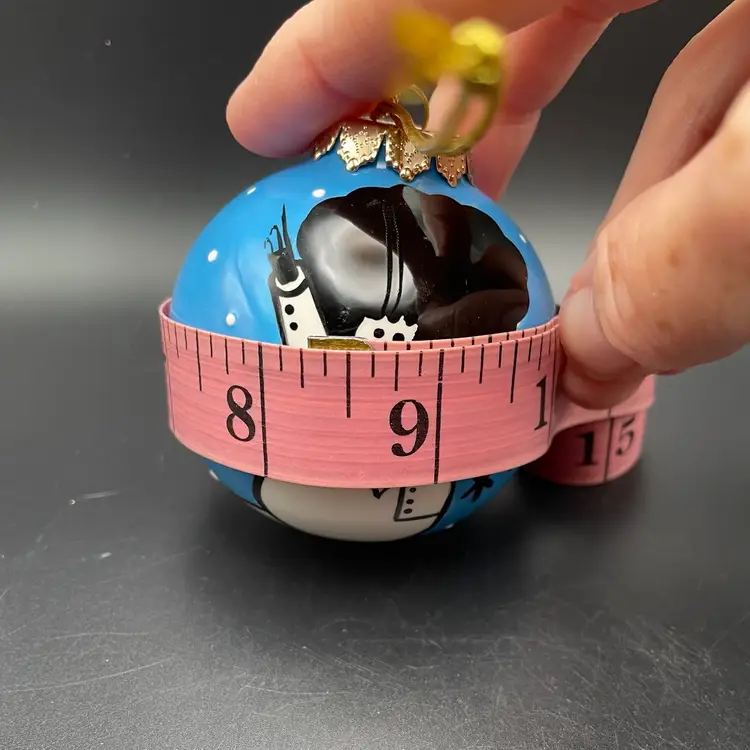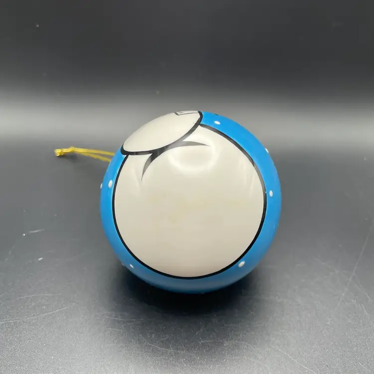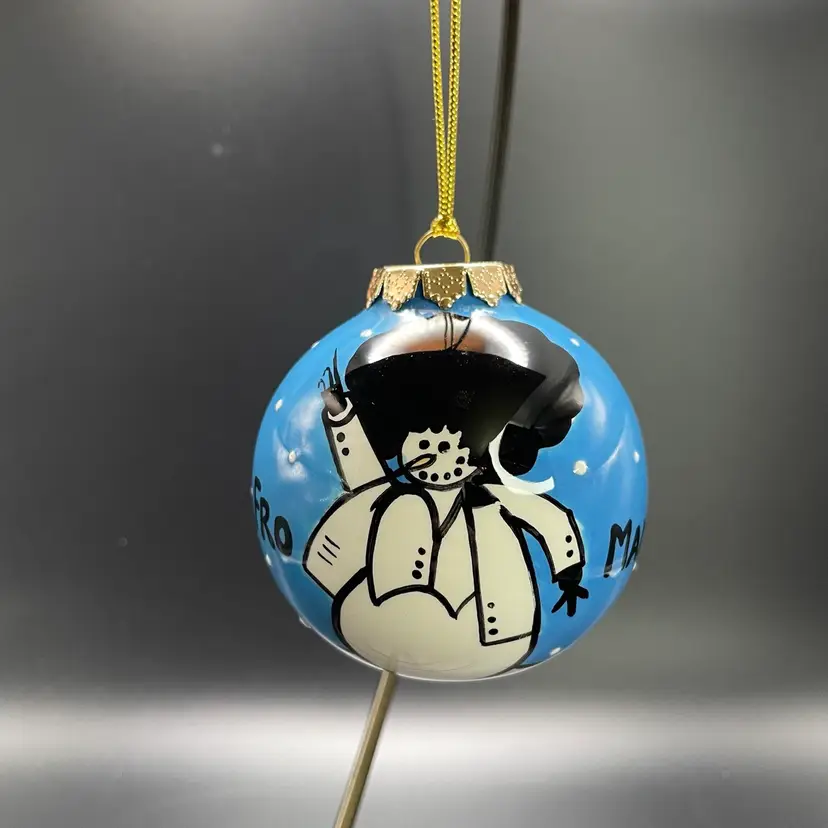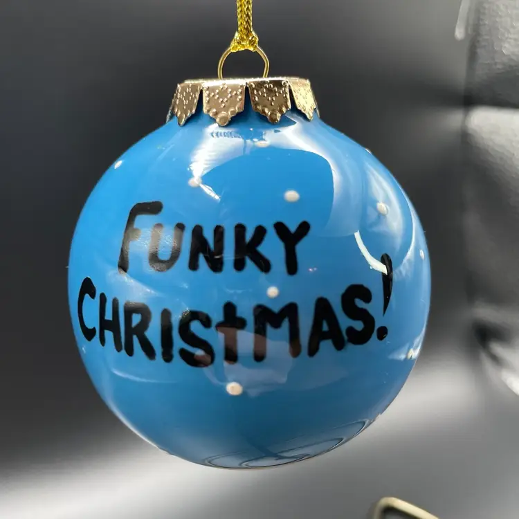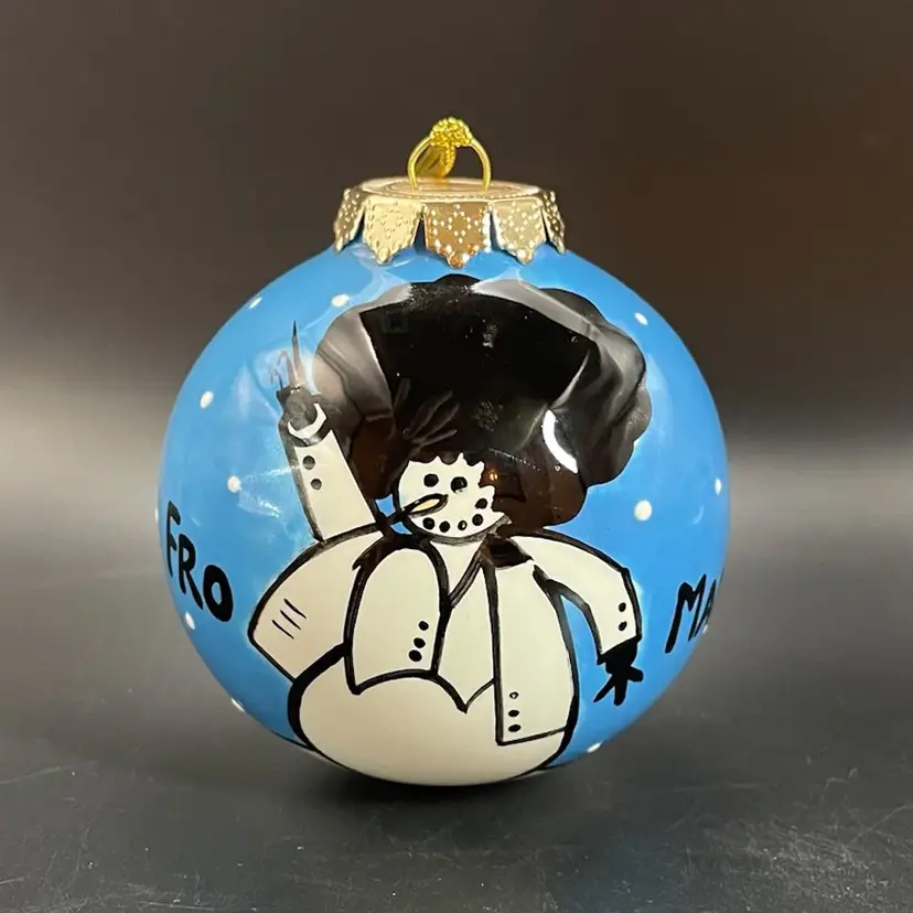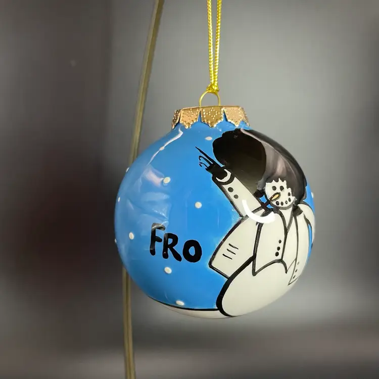 This is a whimsical hand painted ceramic ornament with a 1970's style snowman motif. One side of the snowman says Fro and the other says Man. The back says Funky Christmas! Measures approximately 2.75" in diameter. No chips or cracks.