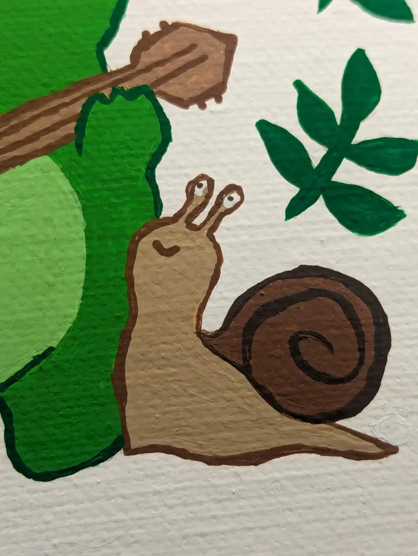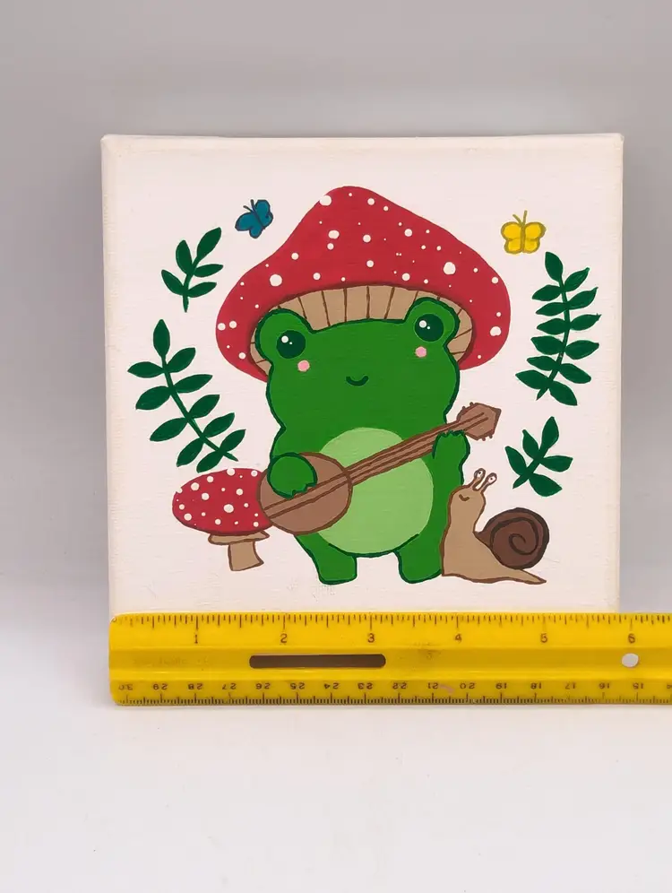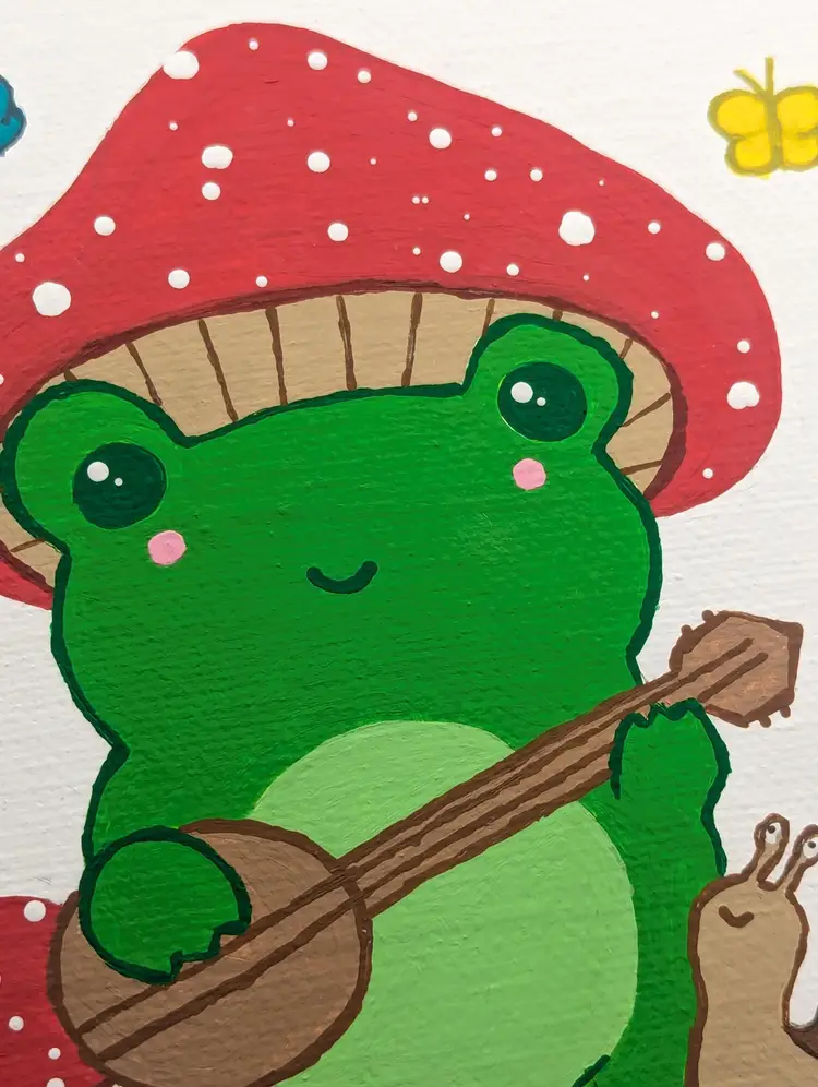 Mini mushroom froggy painting has tiny tiny details like mushrooms and a little snail by the frog.