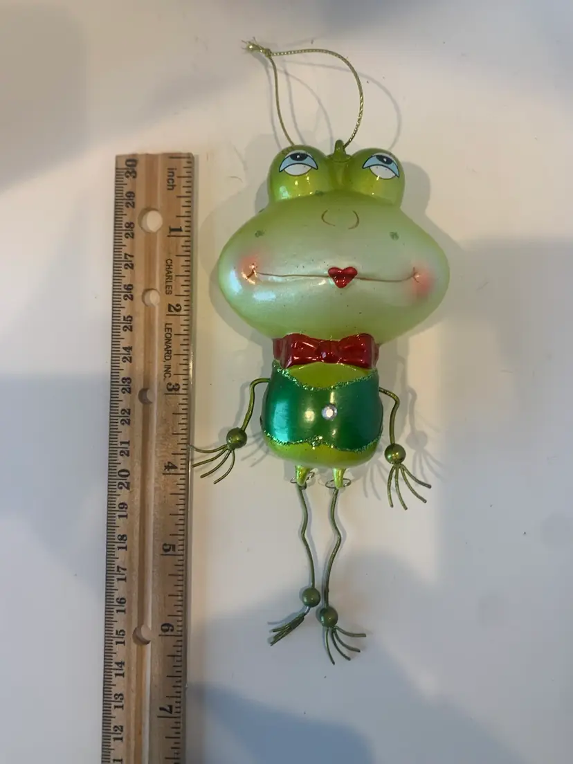 It’s dressed festively with a red bow tie and a metallic green torso. The frog’s arms and legs are made of thin wire, giving it a fun, dangly look, with bead-like hands and feet adding to its charm. It hangs from a gold string, making it a cheerful and quirky addition to a holiday tree or whimsical ornament collection.
