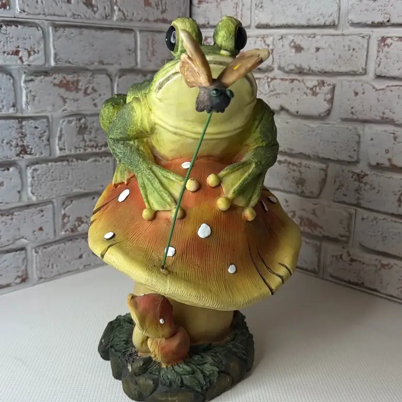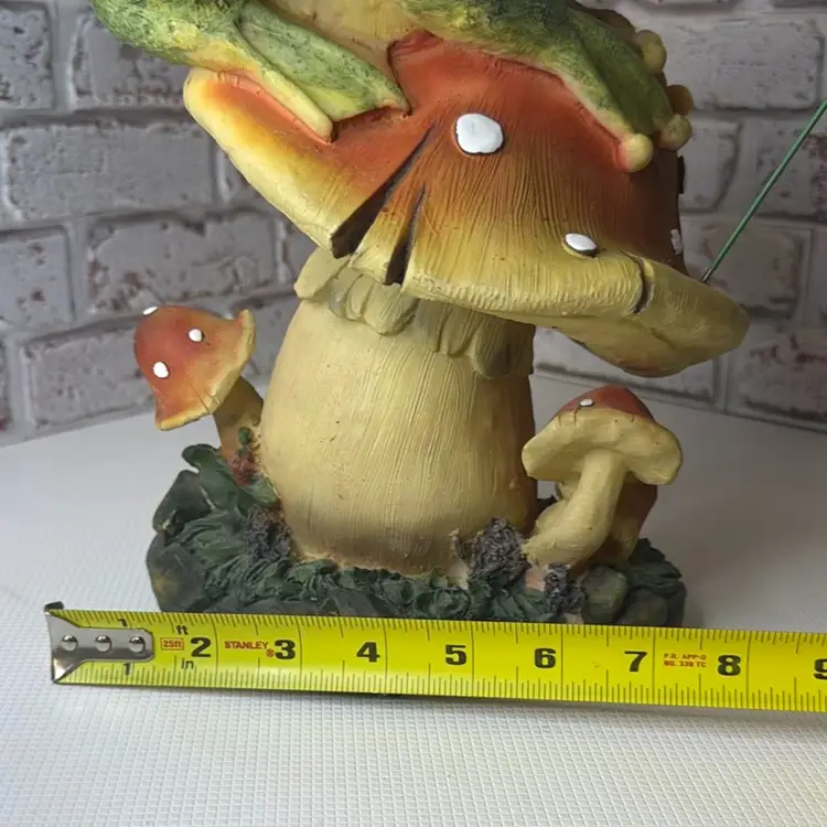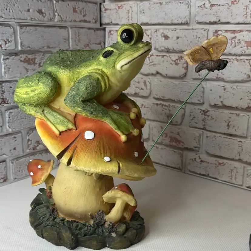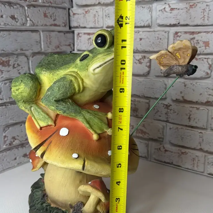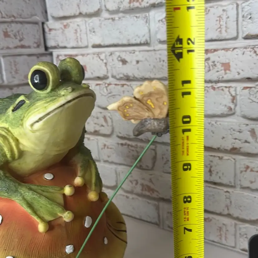 Measures almost 12” tall and buttery from the bottom is 11” and base is 8” long. This was outside I look the best compared to the rest and for someone that like frogs and butterflies it looks great and also the butterfly wings do have some minor flea-bites