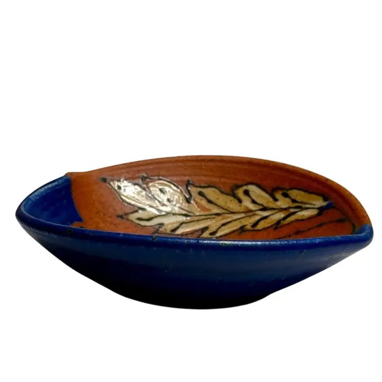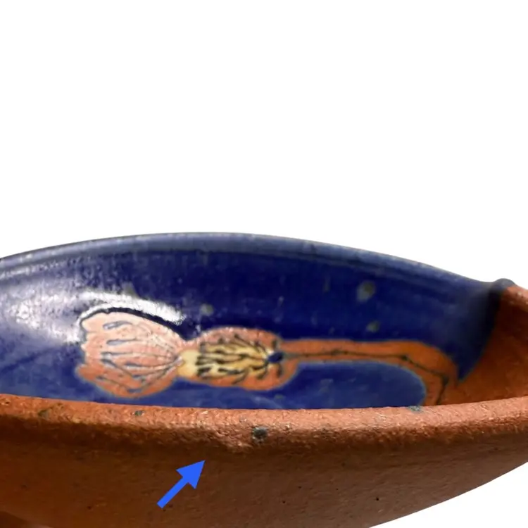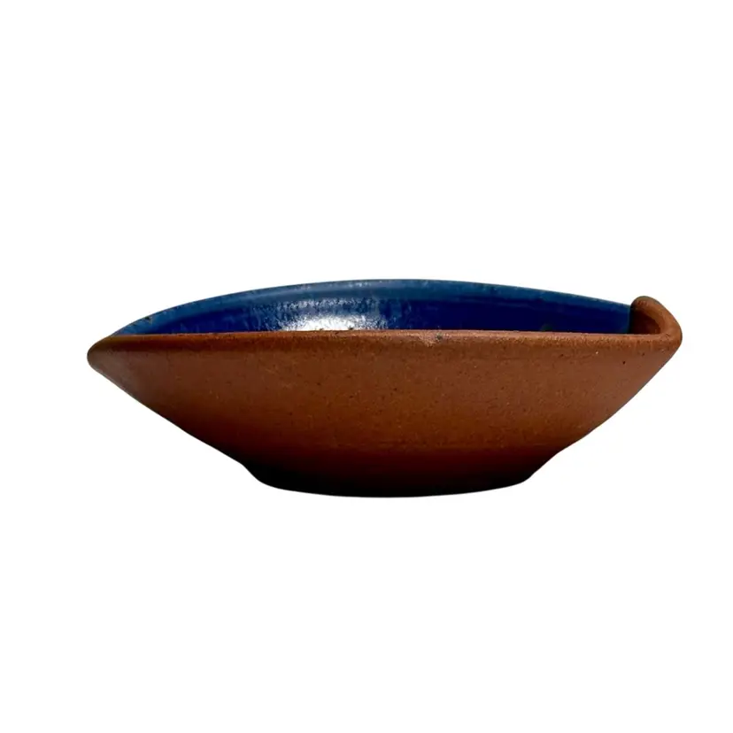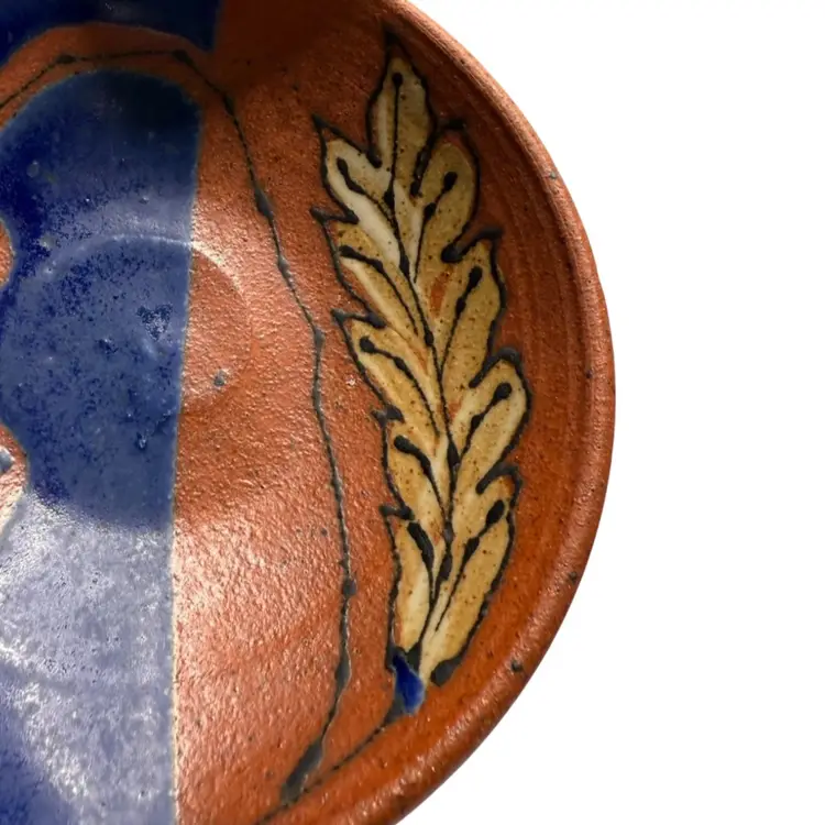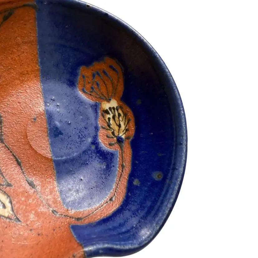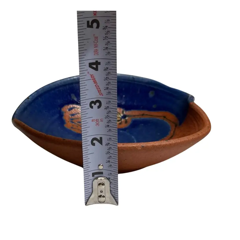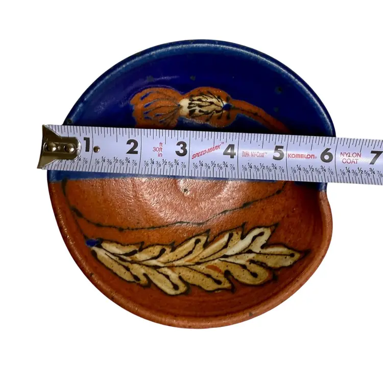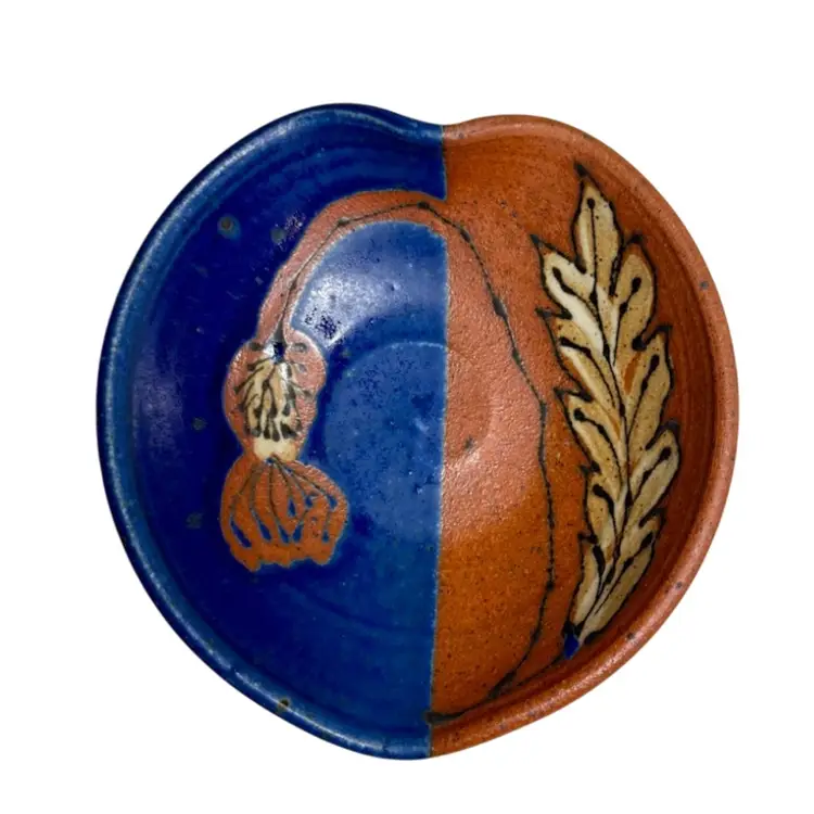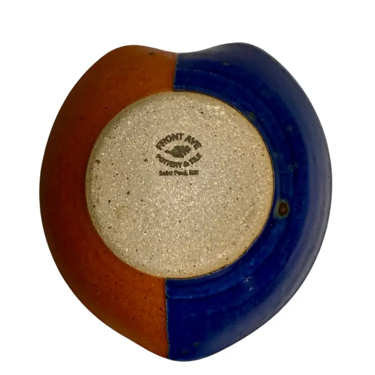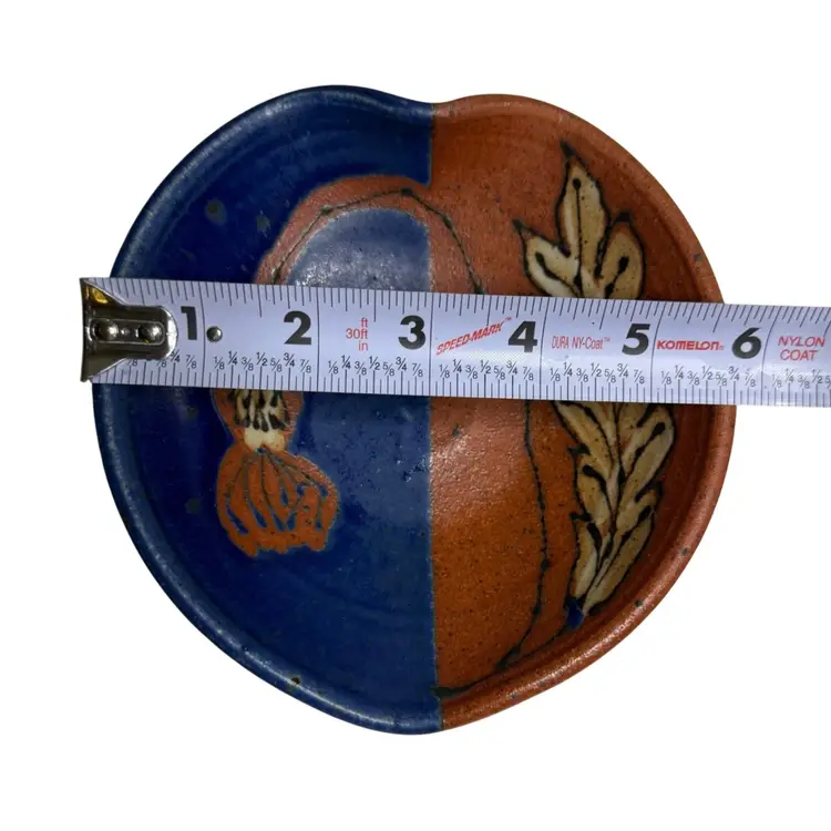 Beautiful colors, this bowl could be used for berries, sauces, jewelry or a trinket dish. Condition: Has a shallow divot on the edge of the rust side. Looks like it may have happened while creating. It’s smooth and doesn’t show from the top. Measurements are approximate. Please see pictures for condition and measurements as they are a part of the description. Thank you for looking!