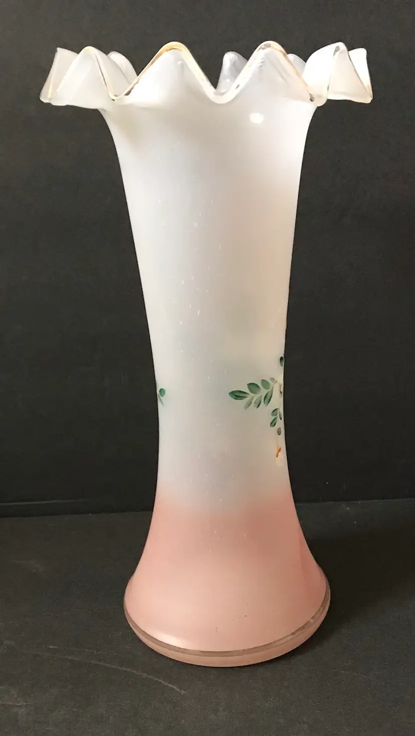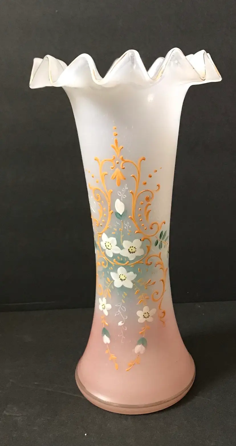 9” frosted/ombré peach ruffled rim vase. Enameled hand painted. Some of the gold on rim is worn. No chips or cracks.