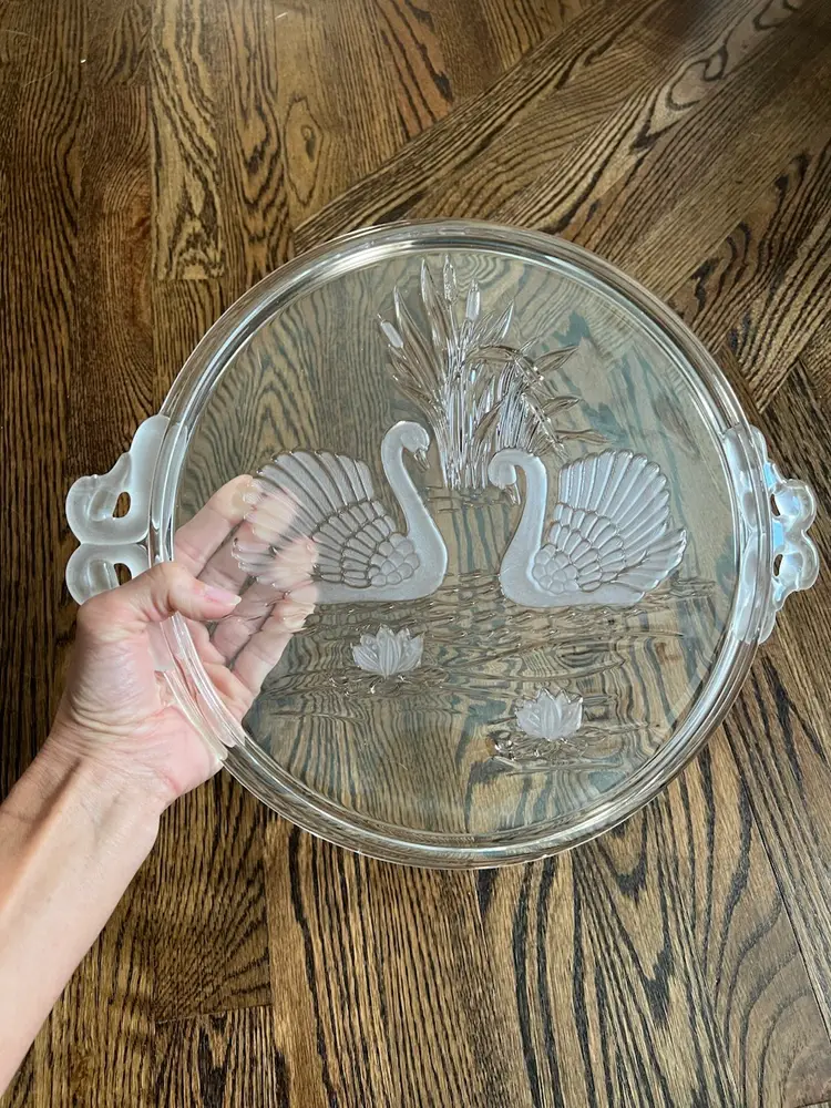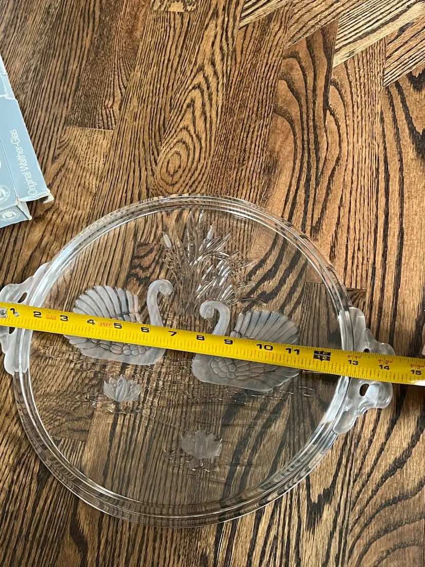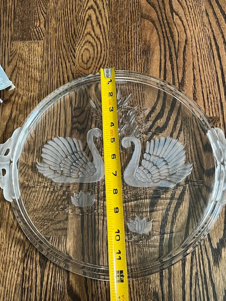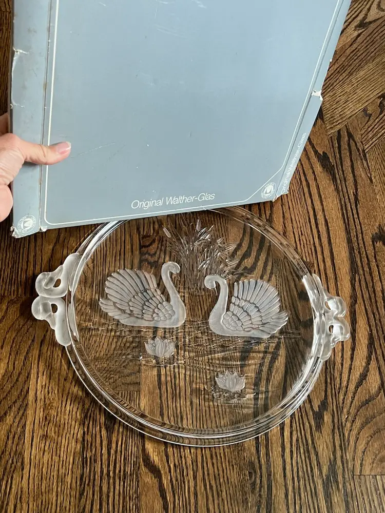 New old stock in the box swan platter no chips or cracks. It’s just beautiful 15 inches handle to handle and flatter itself is 12 inches in diameter.
