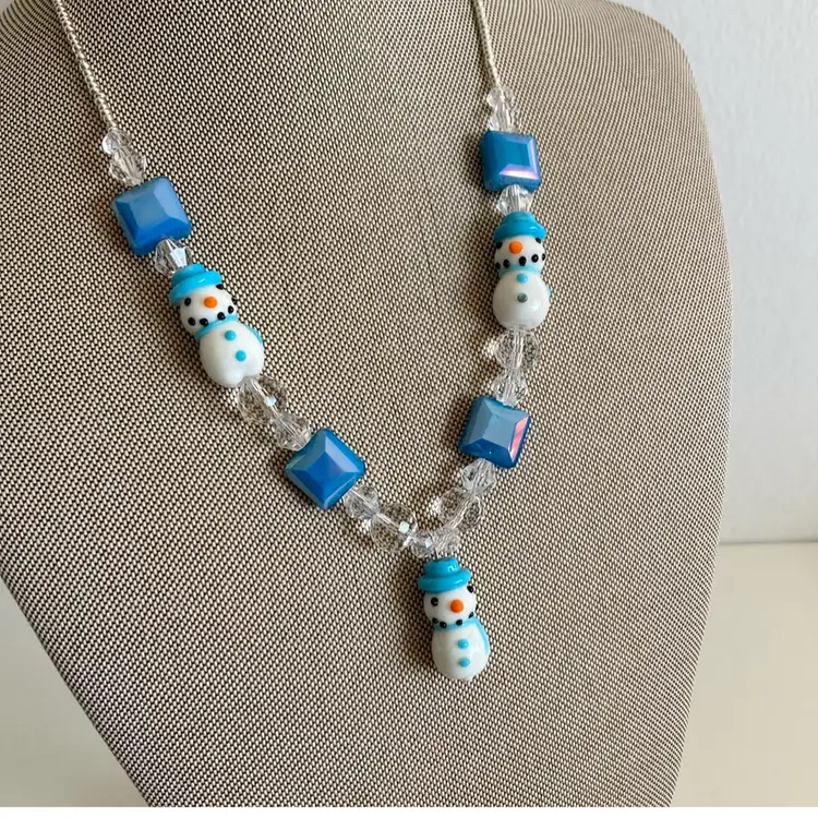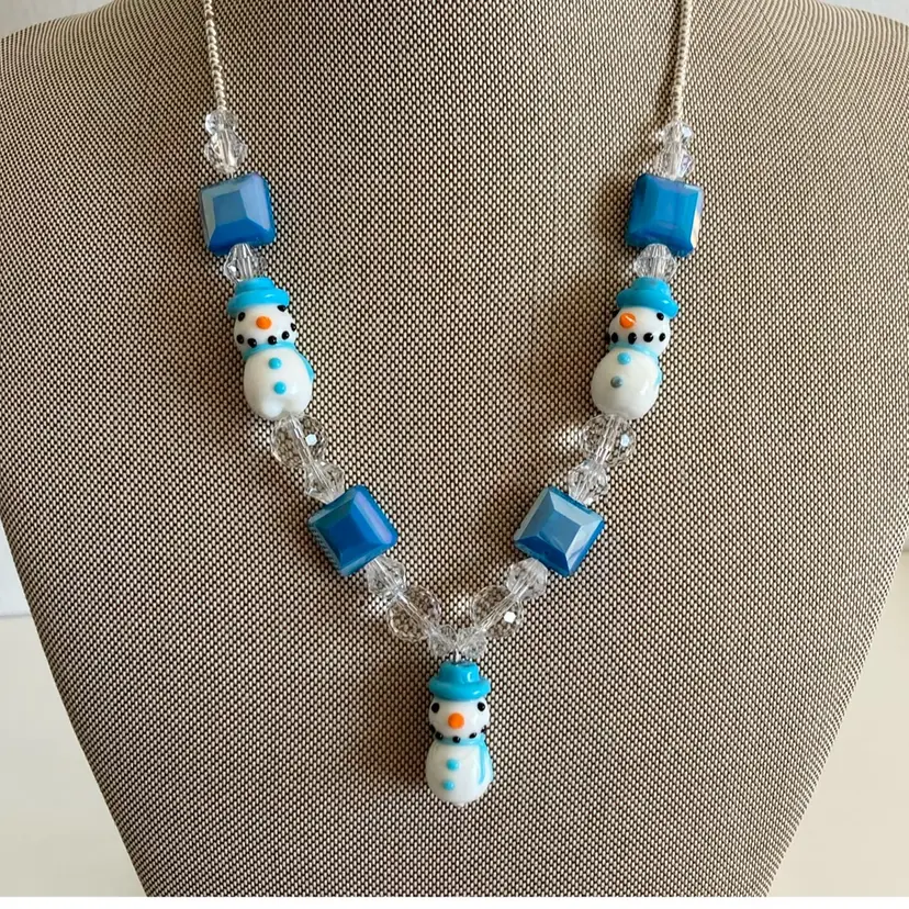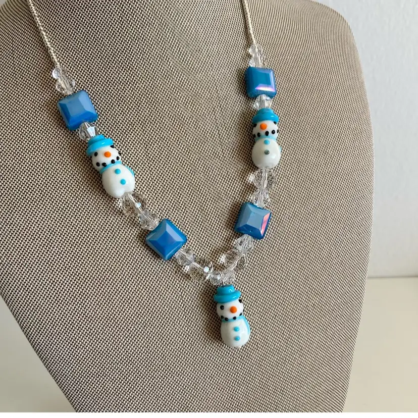 Frosty ice lampwork glass snowman beaded necklace. This is an upcycled necklace created with vintage beads and findings. The necklace measures 18” and fastens with barrel closure.