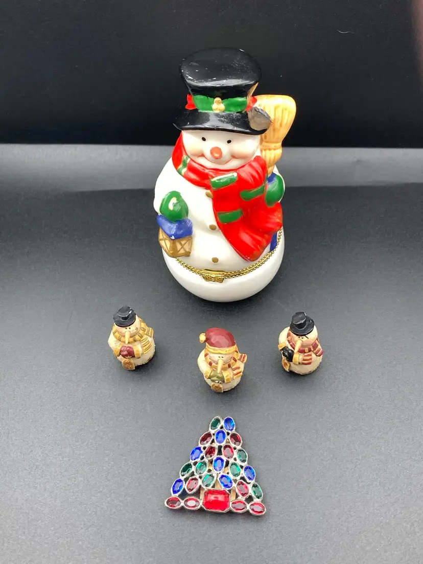 Frosty Nights Vignette! Vintage Rhinestone Dress Clip (1 1/2” Wide 1 1/2” Tall) Porcelain Snowman Trinket Box (4 3/4” Tall 2 1/4” Wide 1 Tiny Chip On Hat As Seen In Pic) B. Lloyd 2009 Trio Of Snowmen Family, Believe And Frosty (1 1/2” Tall 3/4” Diameter) NEW to District? Enter code Michel42 into your wallet prior to your first ever purchase and save $5 off any $10 or more! Give me a Follow and I WILL Follow you back!