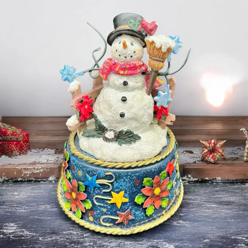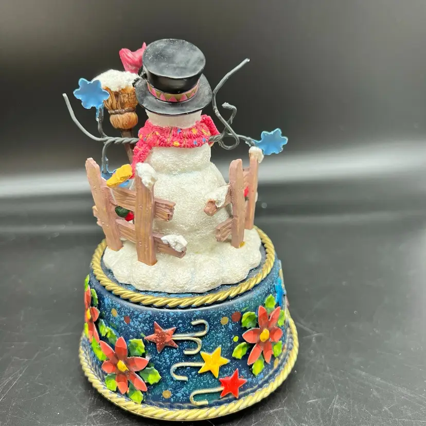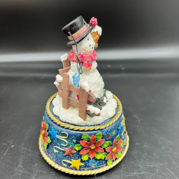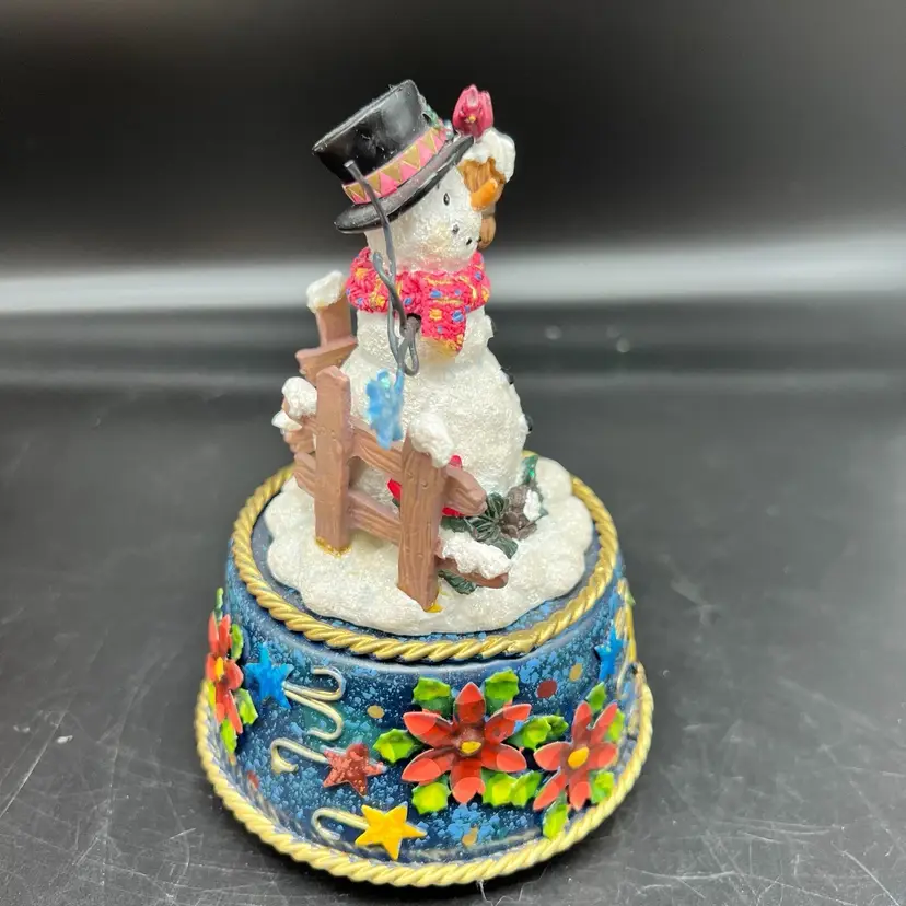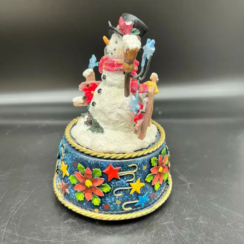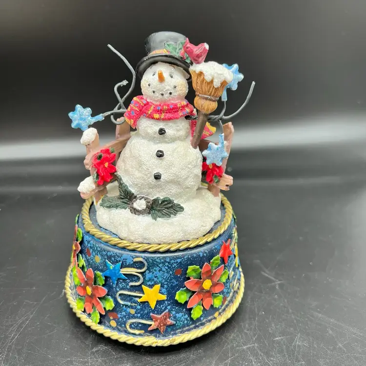 Frosty Snowman Music Box Christmas Blue Metal Base Poinsettia Cardinal 3D As Is