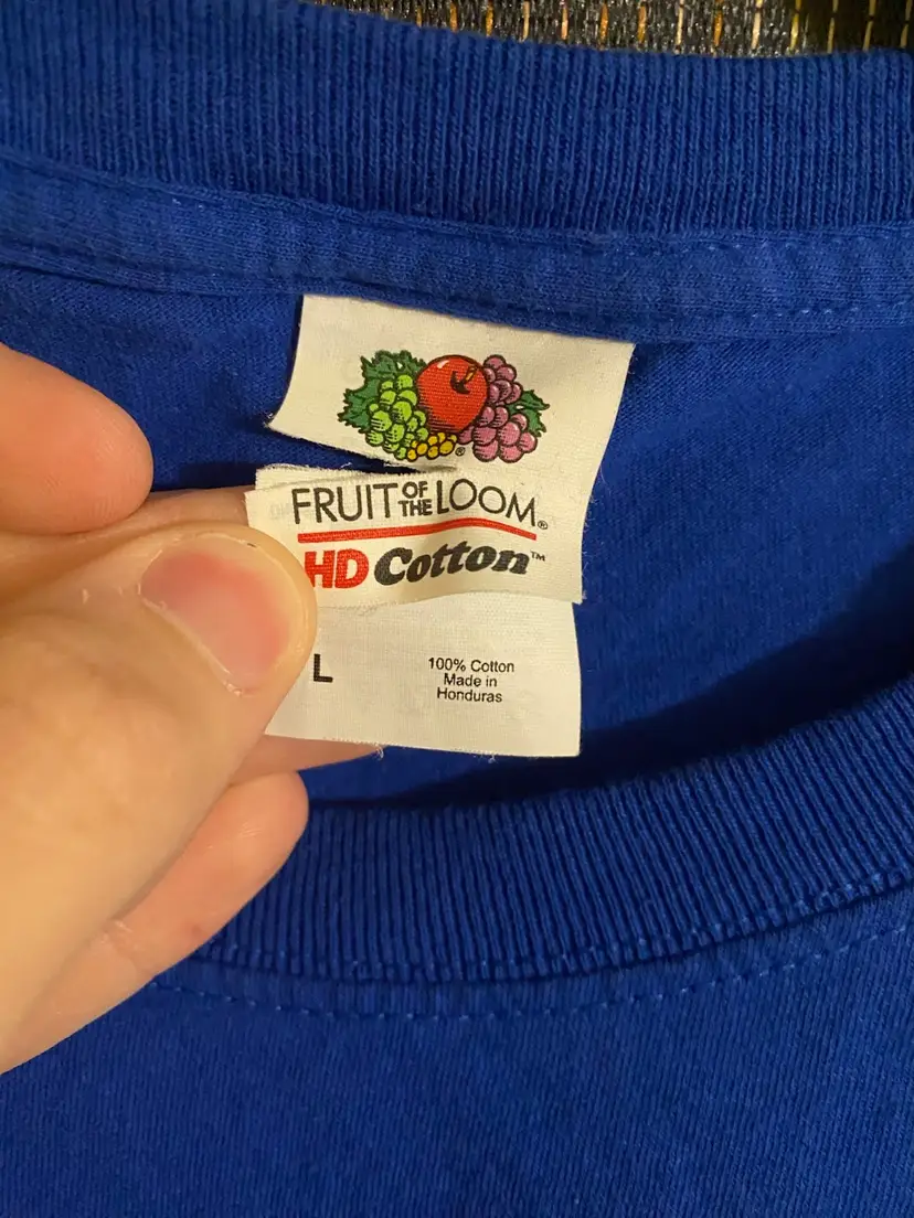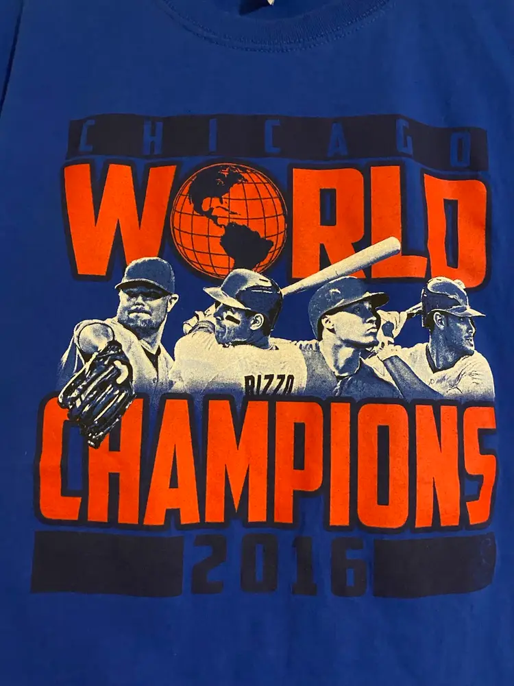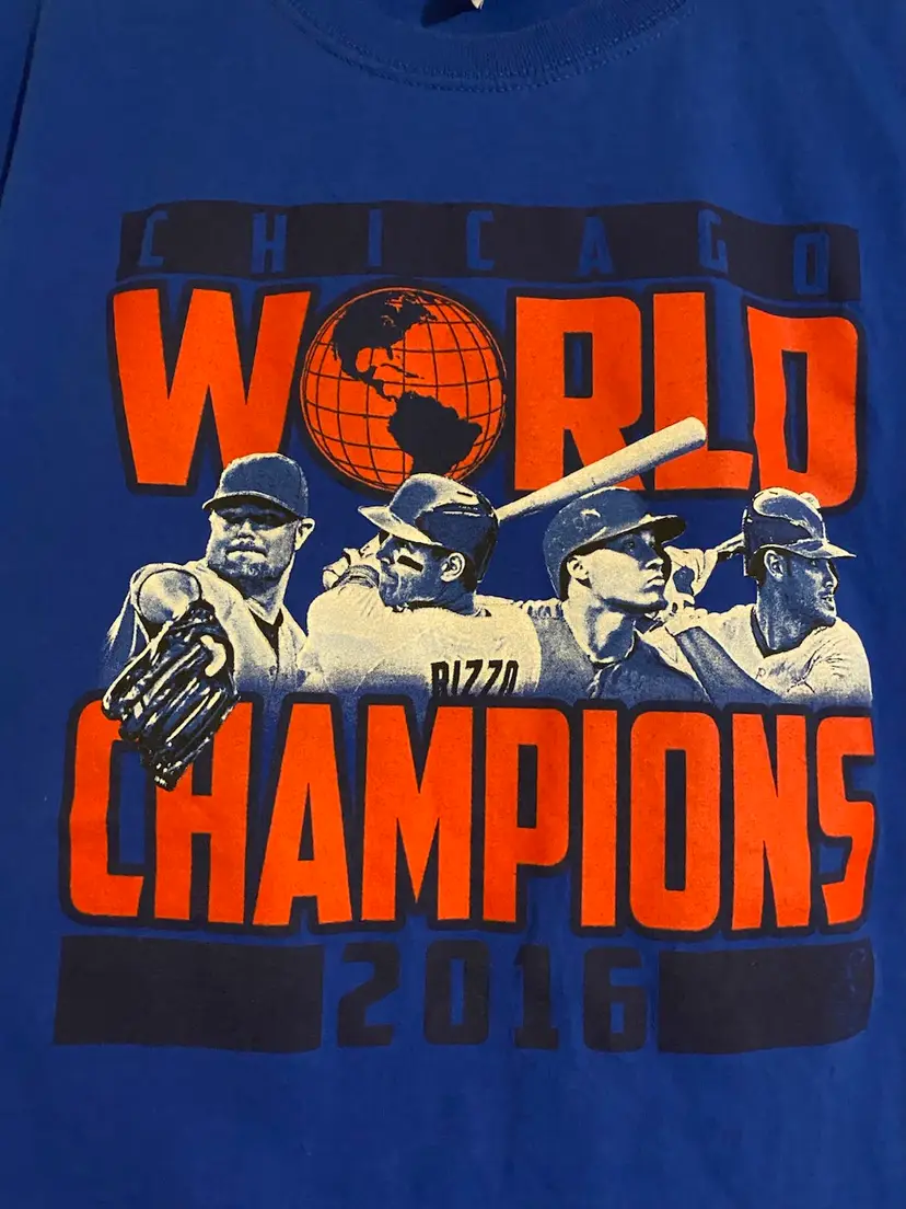 You are purchasing one Men's Size Large Blue MLB Chicago Cubs World Champions 2016 Short Sleeve T-Shirt by Fruit of the Loom. This T-Shirt is in great condition with no holes or stains.