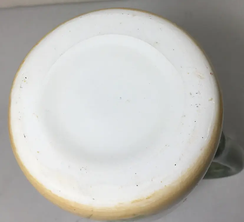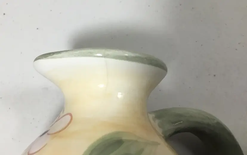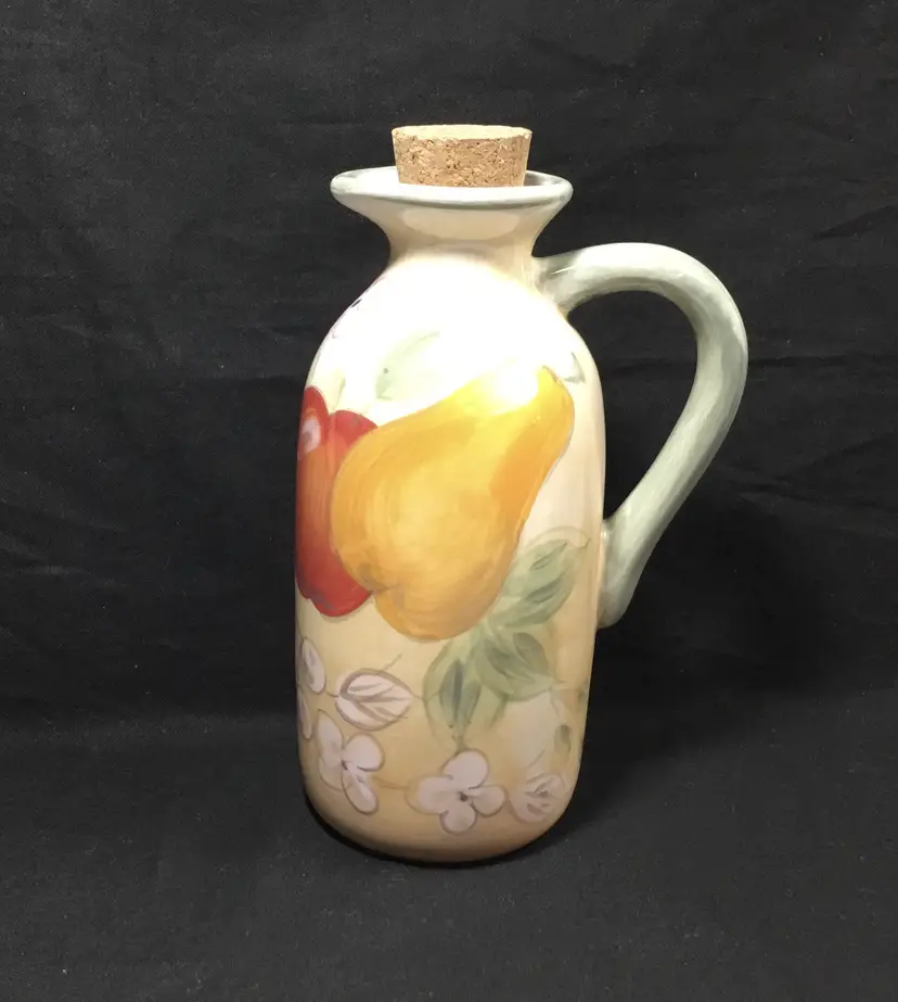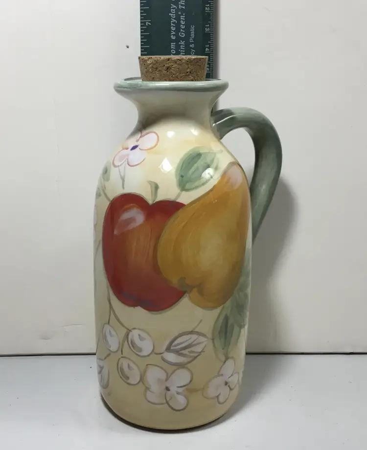 6 inch tall oil or cream pitcher, holds 1.5 cups of liquid. Beige background with pale green handle and rim. Has a look of hand-painted fruit, plums, apple, pear with small leaves and flowers. Very pretty. No maker's name. Hairline crack in neck and rim (see photos)