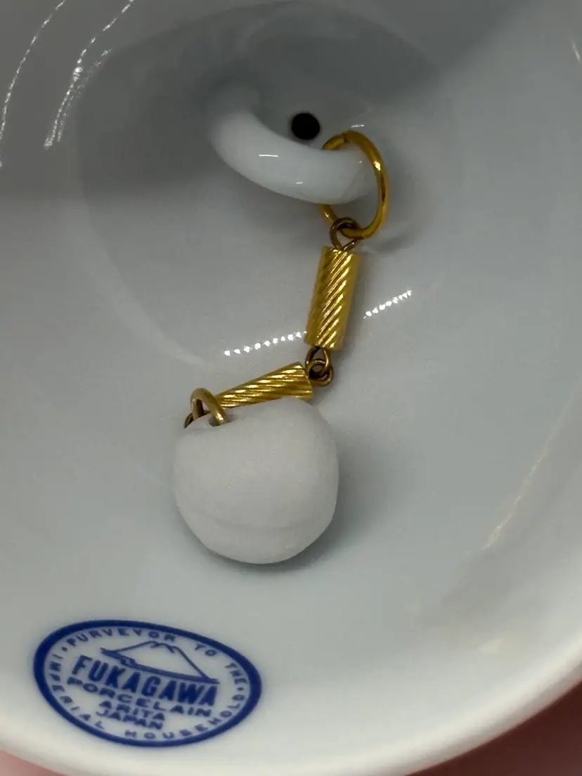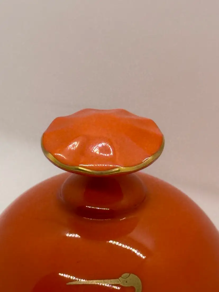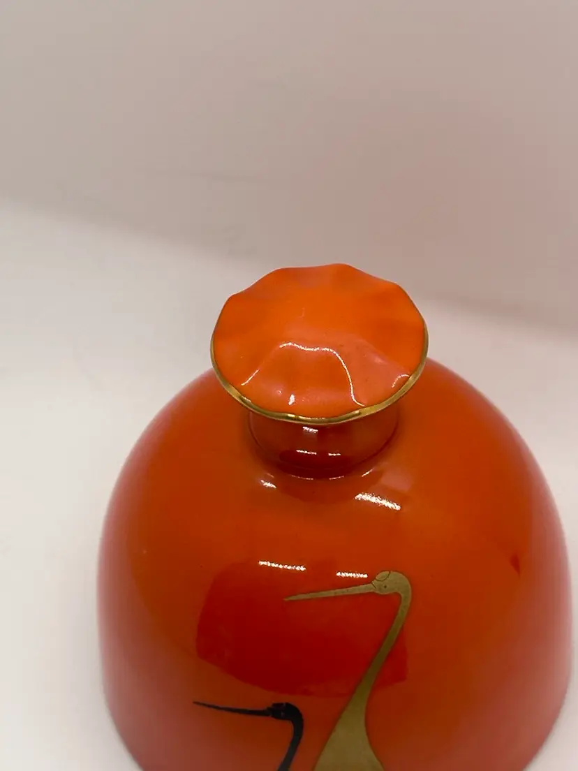 Excellent condition Fukagawa porcelain Arita, Japan, bell. Purveyor to the imperial household. Features a pair of sleek cranes on the outside with a ruffled top, trimmed in gold. No chips or cracks. Measures 4 inches high in 3 1/2 inches wide at the bottom.