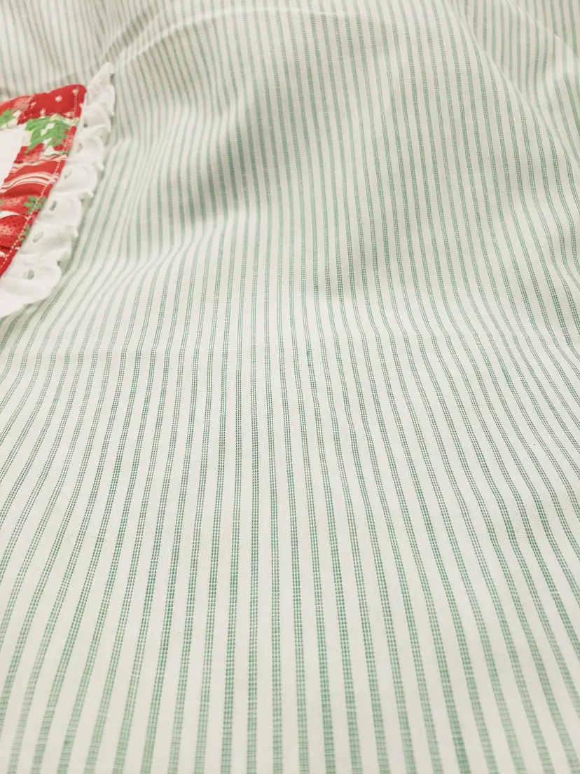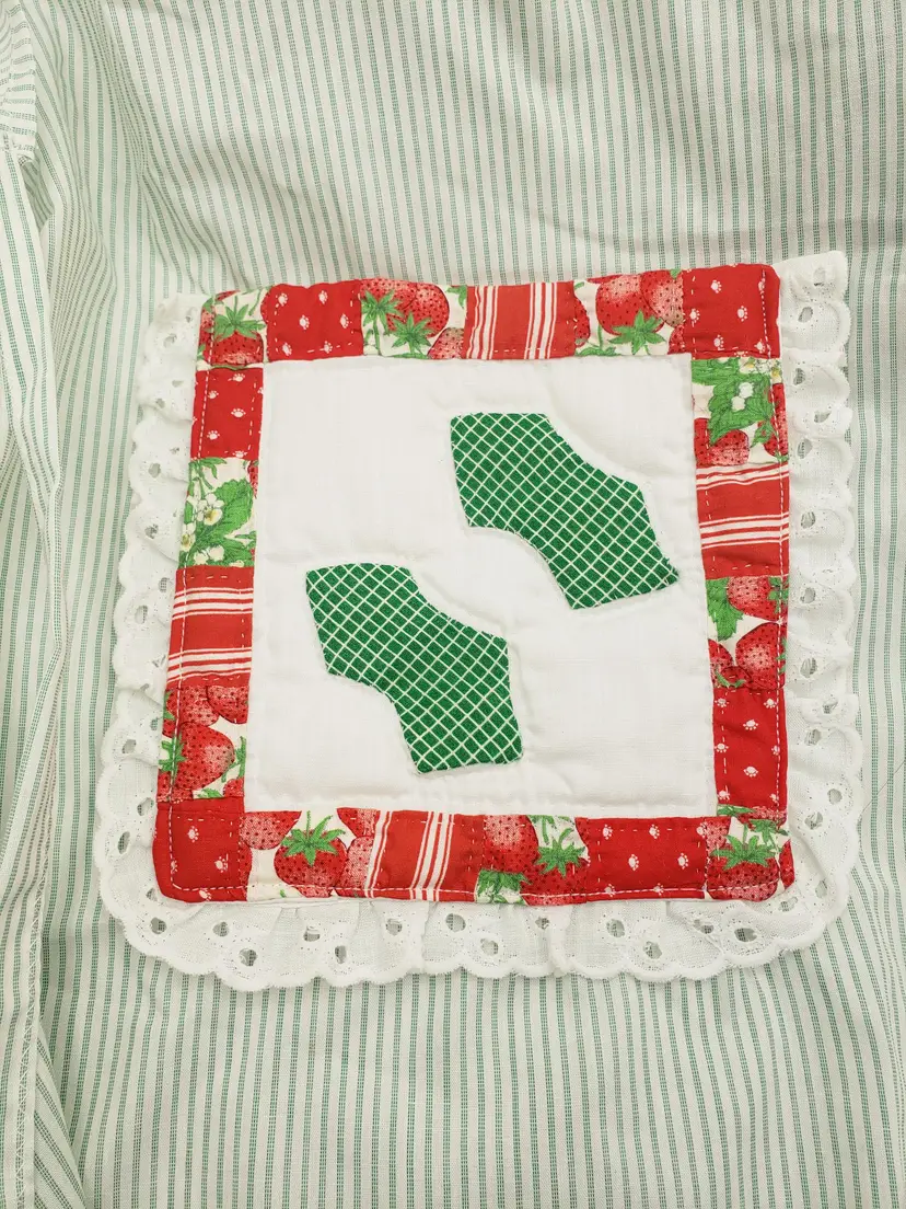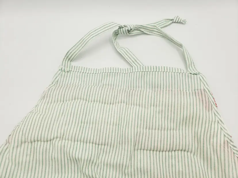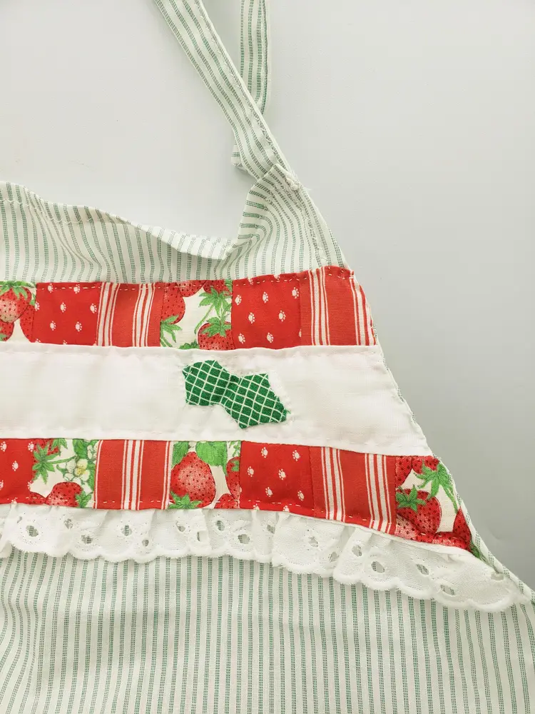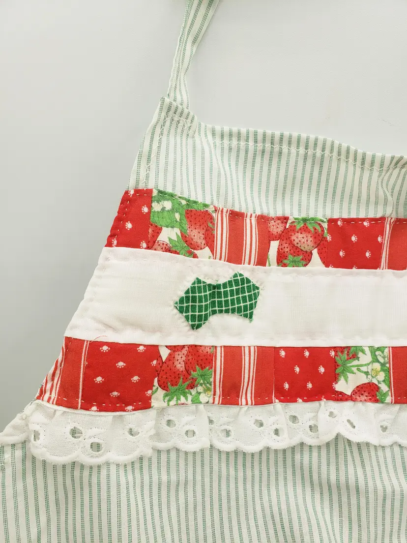 Full Adult Apron Handmade Strawberries, Pocket, Pinstripes, Christmas, Quilted. Quality hand-sewn apron. Measures about 29" long (not including tops ties) and 31" wide (not including side ties). Features quilting technique, pocket, lace trim. No stains, rips or odors. Non-smoking home.