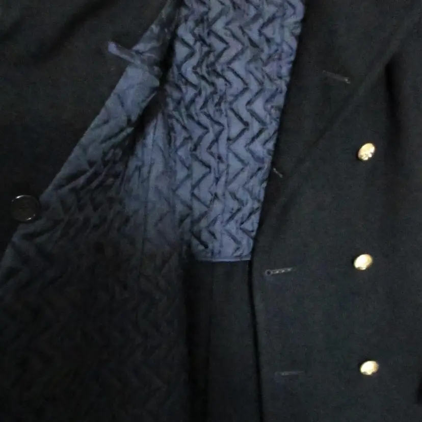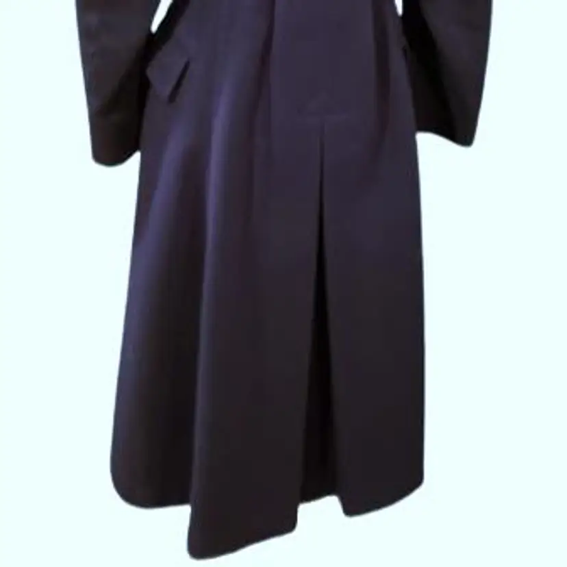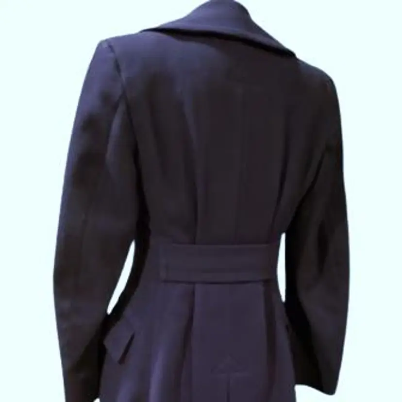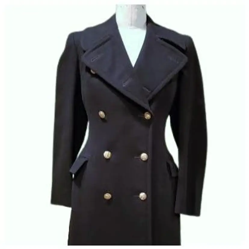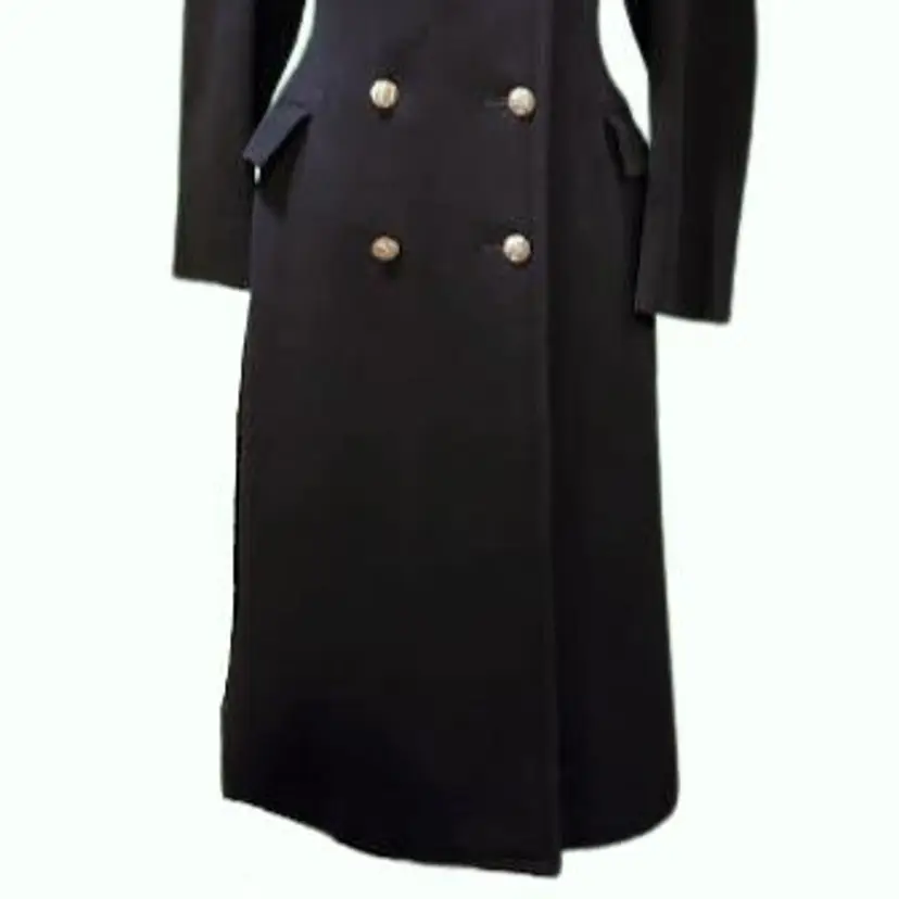 Excellent quality construction, Canadian Navy Officer Coat, possibly 1940s. Extremely warm and wind-blocking for cold temps. Style: like Lesley-Anne Down in Hanover Street (1979) Full-length, heavy-weight wool with padded lining Double-breasted with wide lapel and fabulous high-stand collar Exterior flap pockets & interior breast pocket. Buttons: Wm. Scully Ltd., Montreal Can be buttoned either to the right or left. Color: Dark Navy/Blackish Blue Bust: 33" Tag size: 10 REGULAR No tears or stains. Spots of light wear visible on close inspection. In clean and great overall condition. From pet-friendly home. Great style AND keeps you warm!