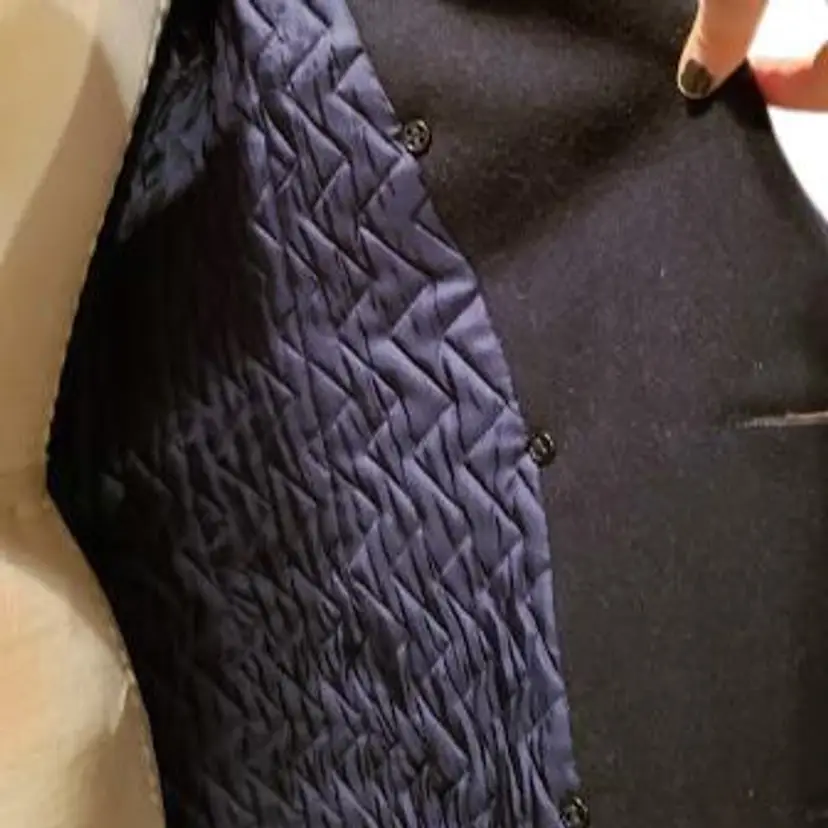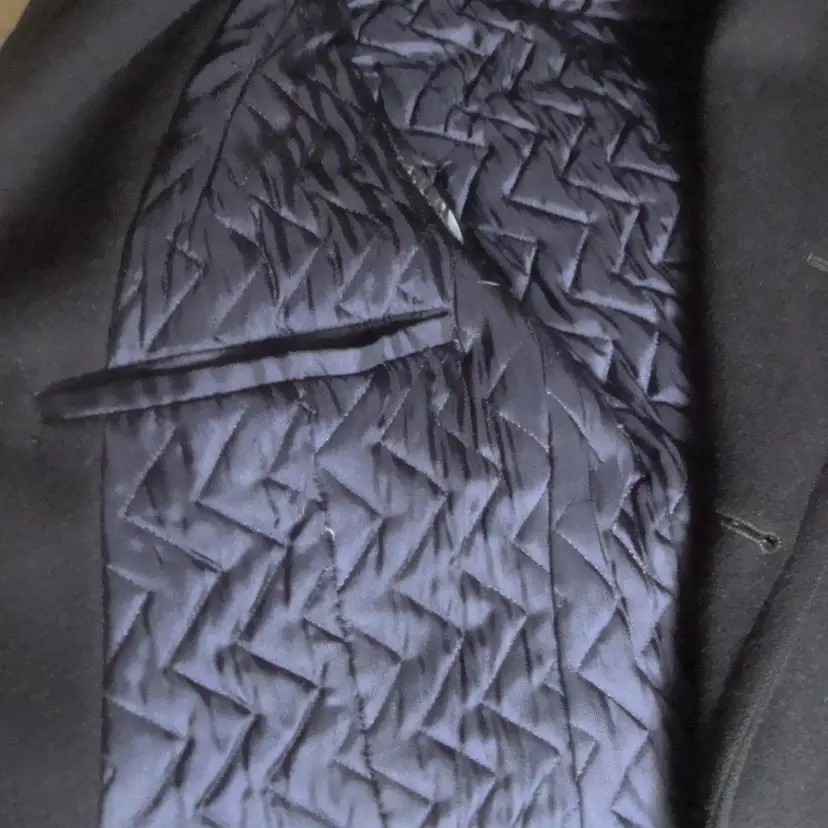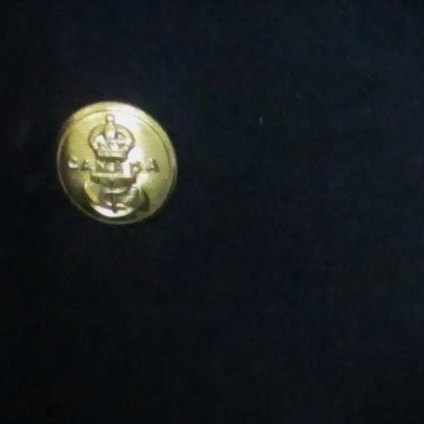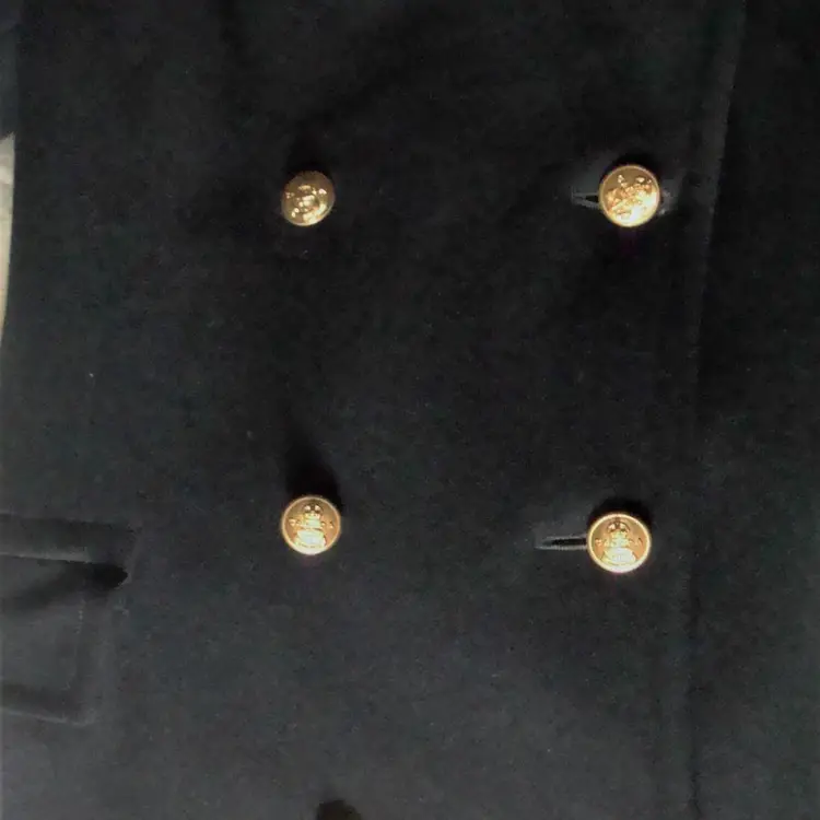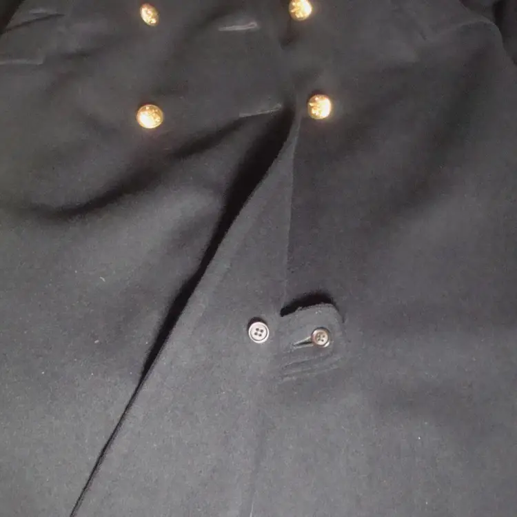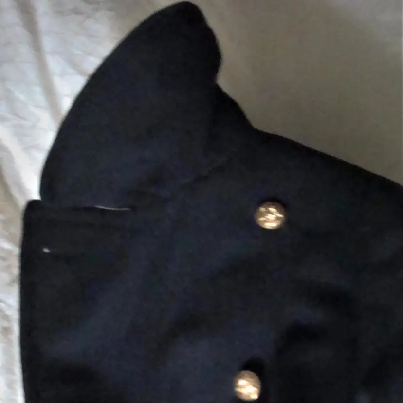 Excellent quality construction, Canadian Navy Officer Coat, possibly 1940s. Extremely warm and wind-blocking for cold temps. Style: like Lesley-Anne Down in Hanover Street (1979) Full-length, heavy-weight wool with padded lining Double-breasted with wide lapel and fabulous high-stand collar Exterior flap pockets & interior breast pocket. Buttons: Wm. Scully Ltd., Montreal Can be buttoned either to the right or left. Color: Dark Navy/Blackish Blue Bust: 33" Tag size: 10 REGULAR No tears or stains. Spots of light wear visible on close inspection. In clean and great overall condition. From pet-friendly home. Great style AND keeps you warm!