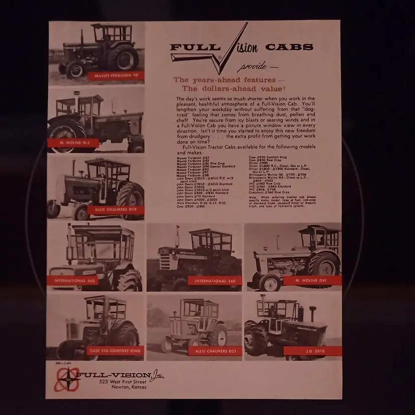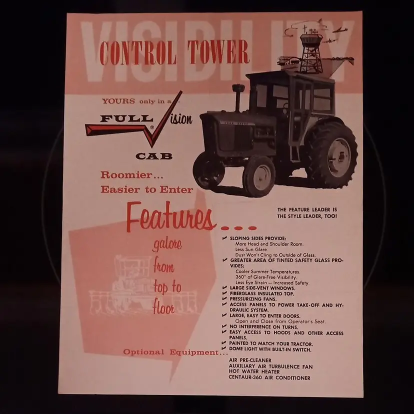This original 1964 sales brochure features full vision cabs for John Deere, Massey Ferguson, Minneapolis Moline, and Allis Chalmers tractors. The brochure measures 8 1/2 inches by 11 inches and is printed on both sides of shiny paper. It includes illustrations and information about the control tower cabs, with details about size and color. The brochure also notes that combined shipping is available upon request from the buyer. This vintage advertisement is a must-have for collectors and enthusiasts of agricultural history.