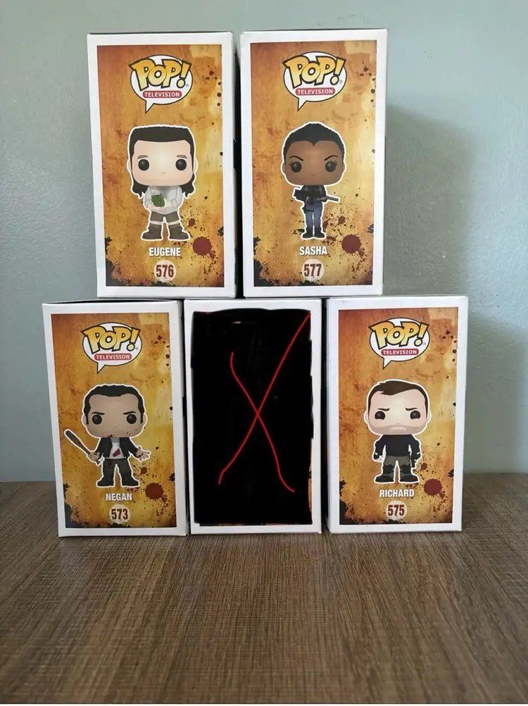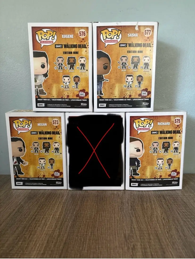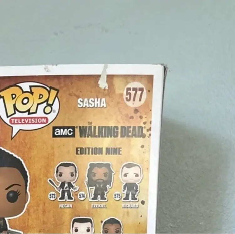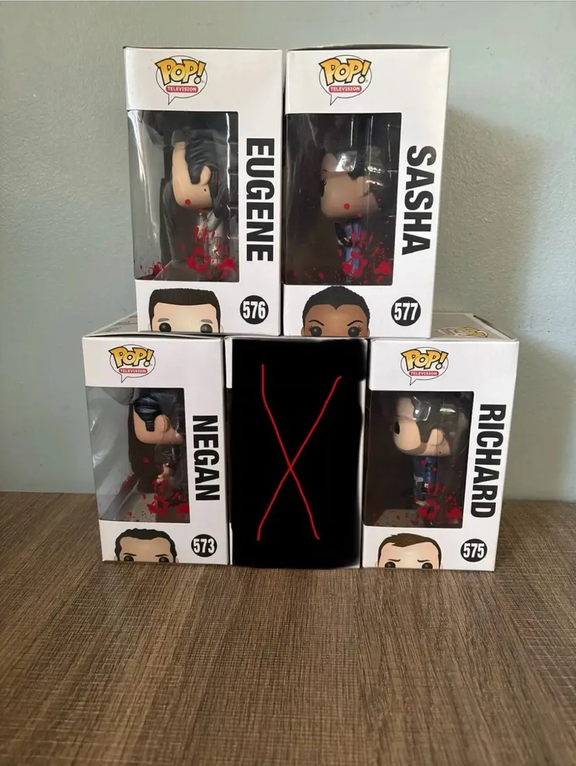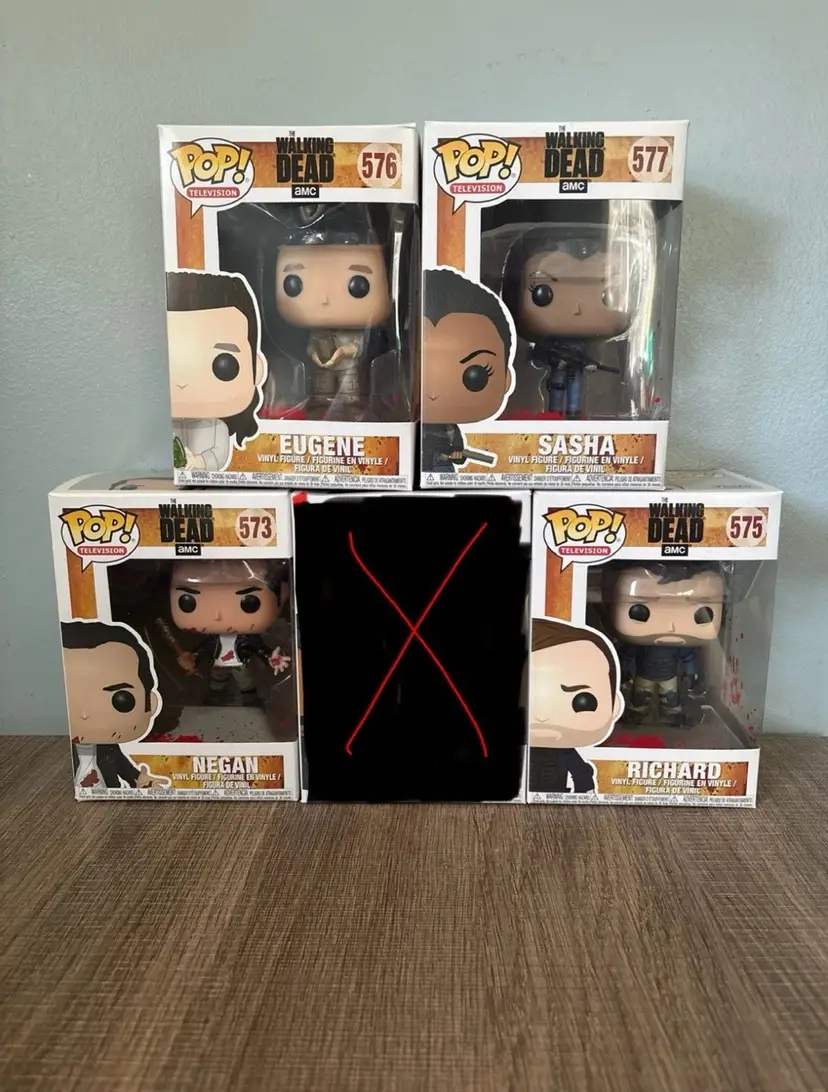 This Funko Pop! Vinyl lot features 4 characters from The Walking Dead Series 9, including Negan, Sasha, Eugene, and Richard. Made of vinyl material, these figures are part of the Pop! Vinyl product line and are considered vaulted, meaning they are no longer in production. The lot also includes a Funko Pop model with a box number of 576 and was released in 2018.