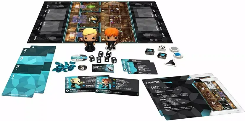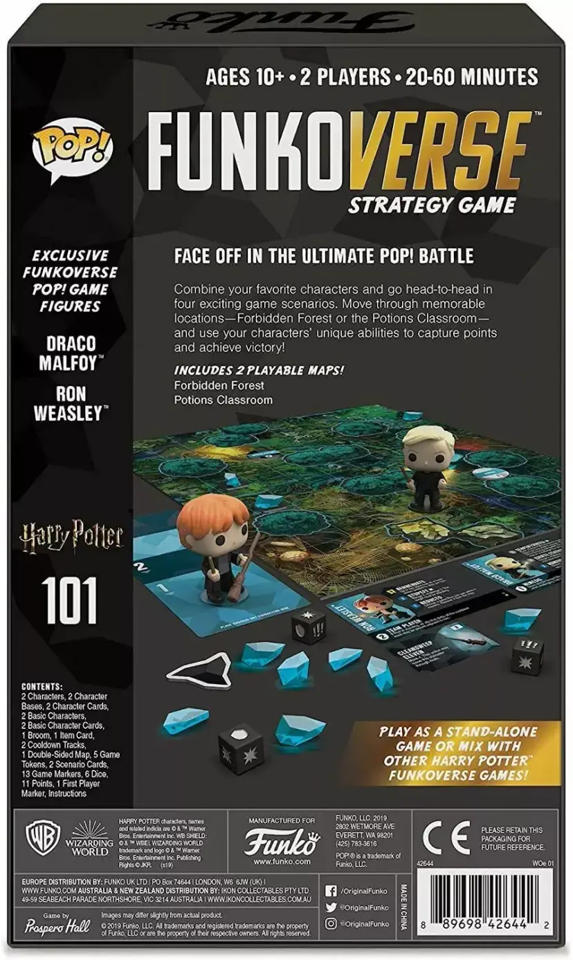 Face off in the ultimate pop! Battle - in the universe strategy game - Harry Potter #101, you'll combine your favorite characters and go head-to-head in four exciting game scenarios. Move through memorable locations – Forbidden Forest or The Potions Classroom – and use your characters’ unique abilities to capture points and achieve victory! What comes in the box: 2 characters, 2 character bases, 2 character cards, 2 basic characters, 2 basic character cards, 2 double-sided scenario cards, 1 broom, 1 item card, 2 cool-down tracks, 1 double-sided map, 5 game tokens, 13 game markers, 6 dice, 11 points, 1 first player marker, instruction manual.