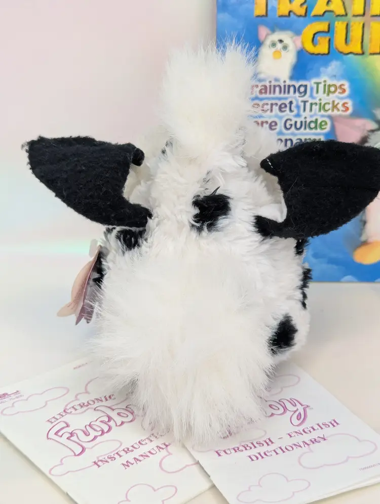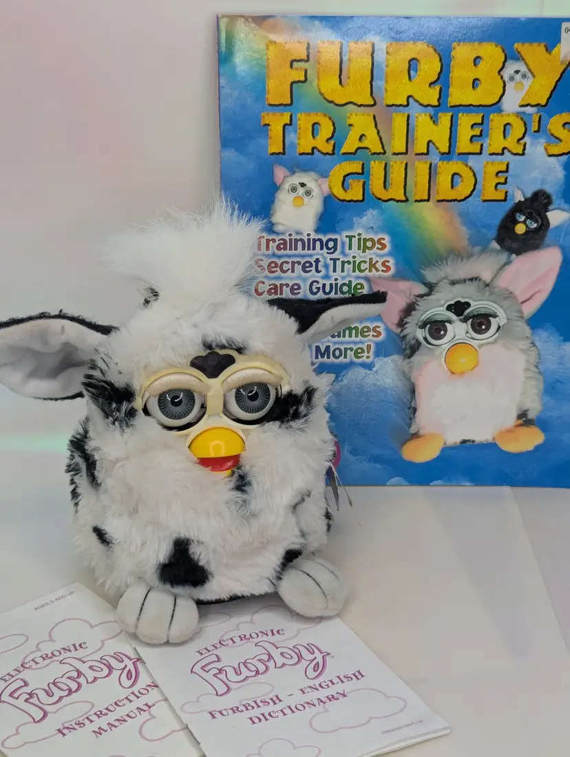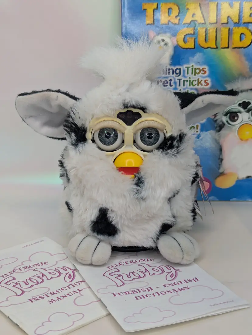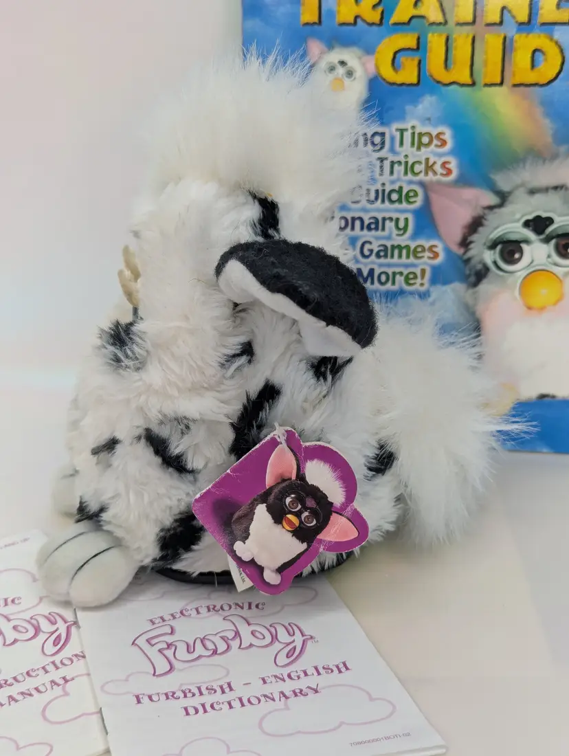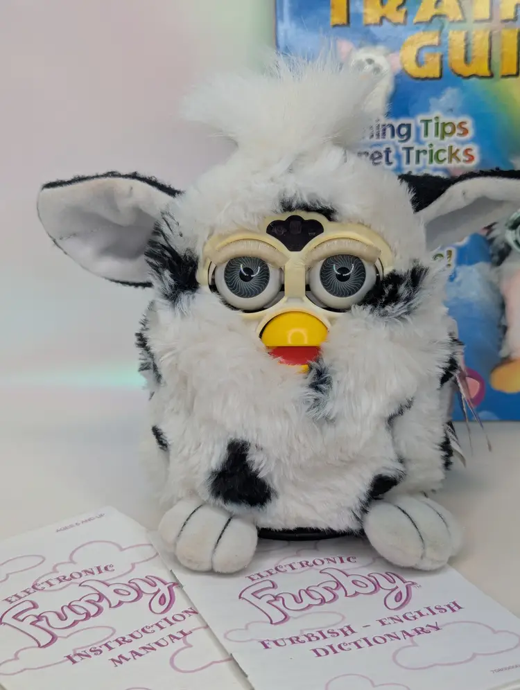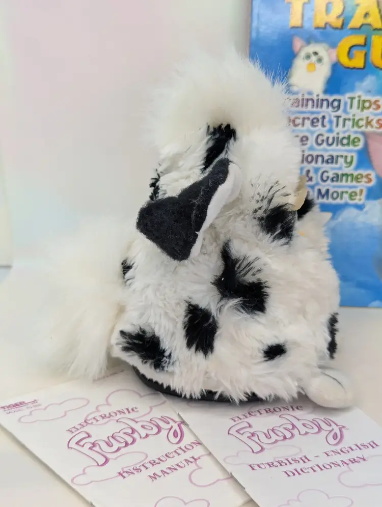 Vintage Dalmatian Furby #70-800 made by Tiger Electronics in 1998 with original Manuals and Extra Book. This furby is in White with black spots and white hair, and White feet and white/black ears. Furby is a interactive toy who will talk to other furbies, and talk when sensors are touched, moved or covered. It's battery compartment has some corrosion that was cleaned up the best i could. He takes 4 AA batteries (Not included). This furby is in good condition, he seems to have light play wear, But there is some yellowing on the eyes from age, and some stains on the bottom of the feet that I could see. No broken pieces or parts. I have also included a 1999 Furby's Trainer book! Good condition, no rips, tears or writing. Great for any furby collector! Furby's come from a smoke free, pet friendly home. They have been lightly cleaned.
