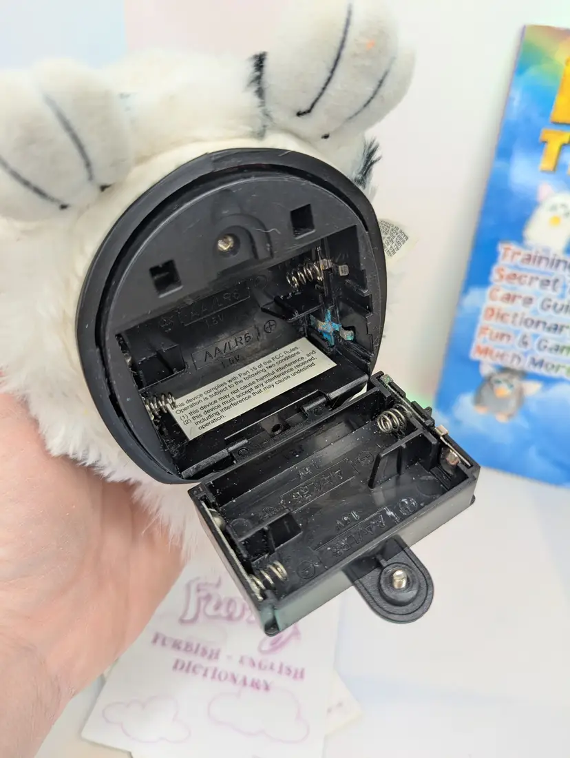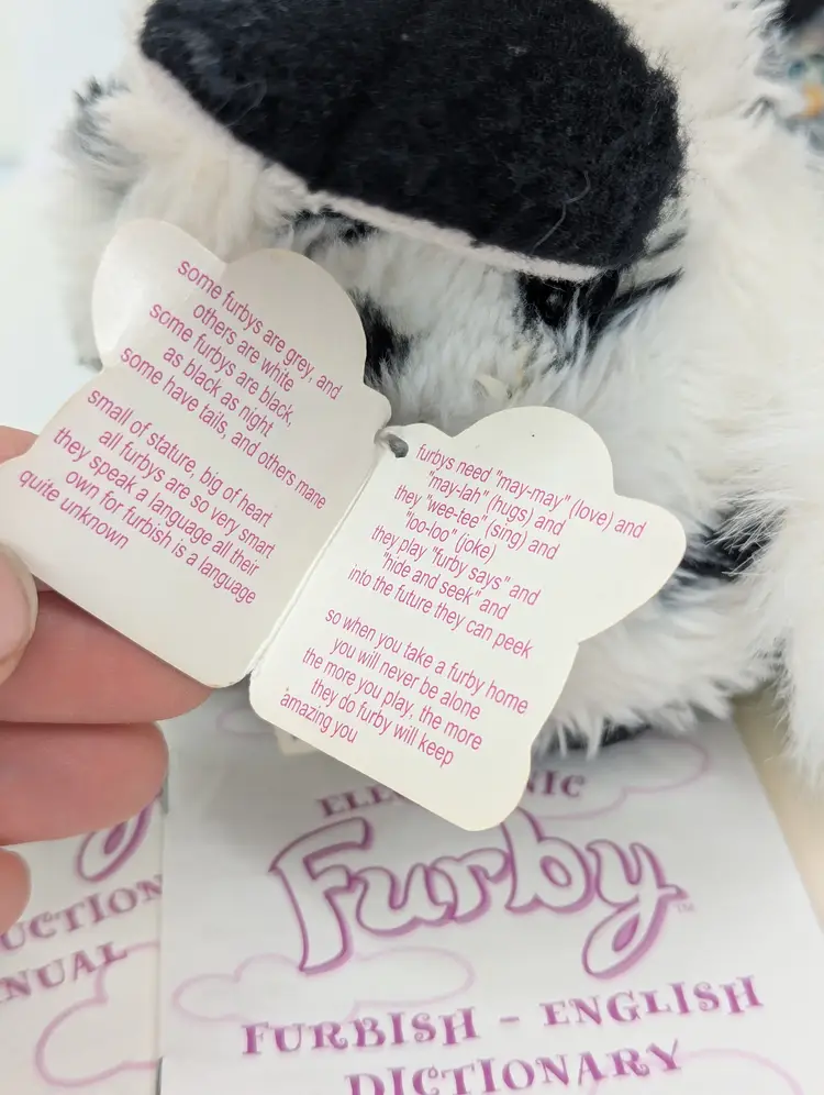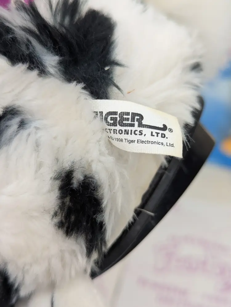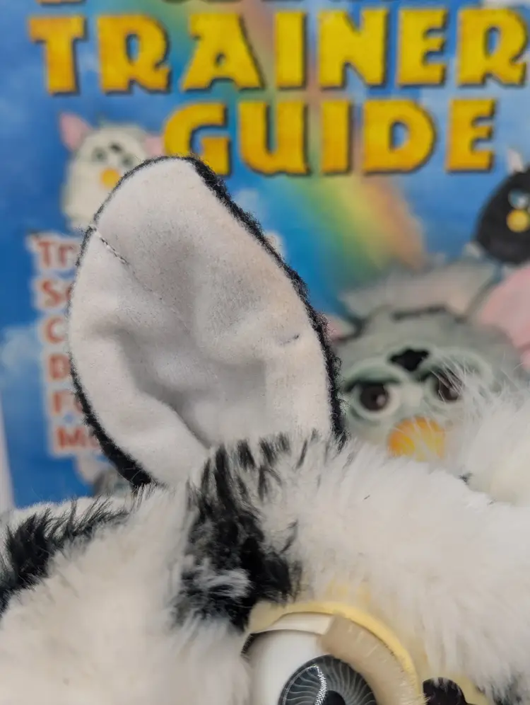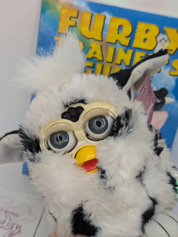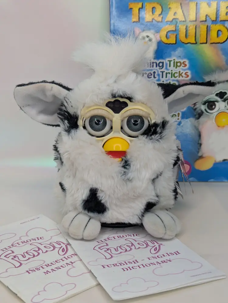 Vintage Dalmatian Furby #70-800 made by Tiger Electronics in 1998 with original Manuals and Extra Book. This furby is in White with black spots and white hair, and White feet and white/black ears. Furby is a interactive toy who will talk to other furbies, and talk when sensors are touched, moved or covered. It's battery compartment has some corrosion that was cleaned up the best i could. He takes 4 AA batteries (Not included). This furby is in good condition, he seems to have light play wear, But there is some yellowing on the eyes from age, and some stains on the bottom of the feet that I could see. No broken pieces or parts. I have also included a 1999 Furby's Trainer book! Good condition, no rips, tears or writing. Great for any furby collector! Furby's come from a smoke free, pet friendly home. They have been lightly cleaned.