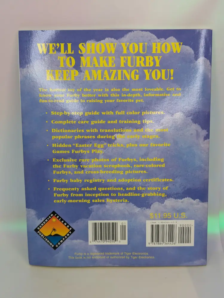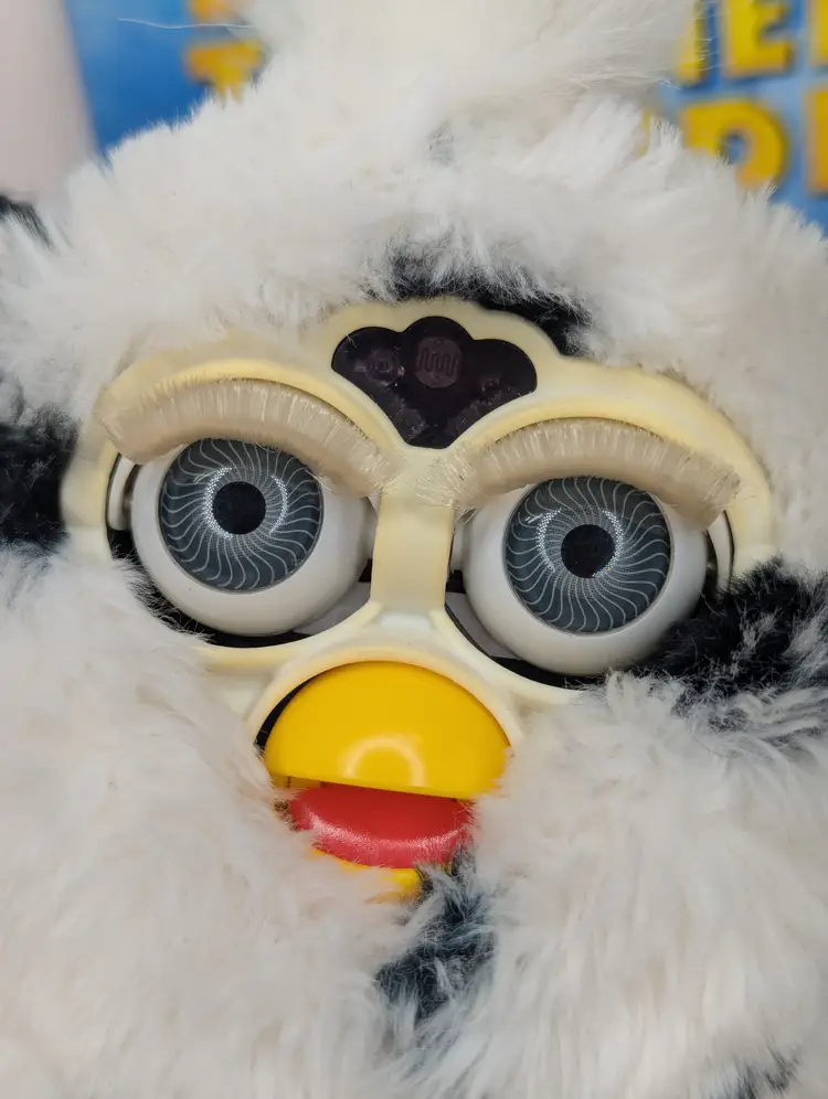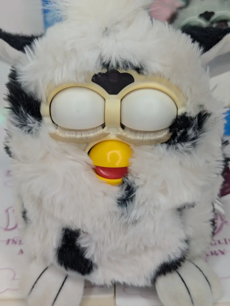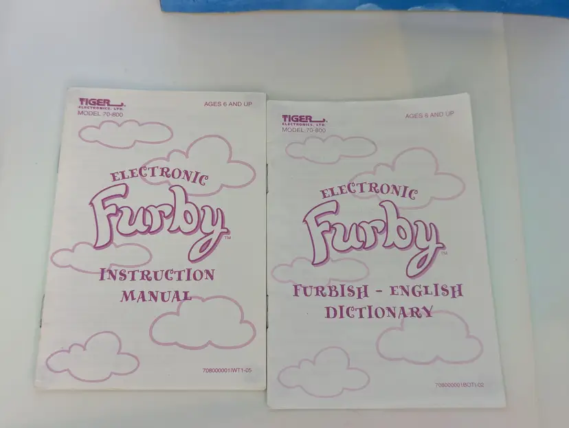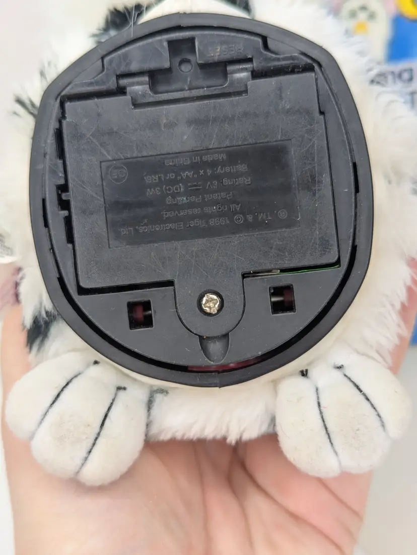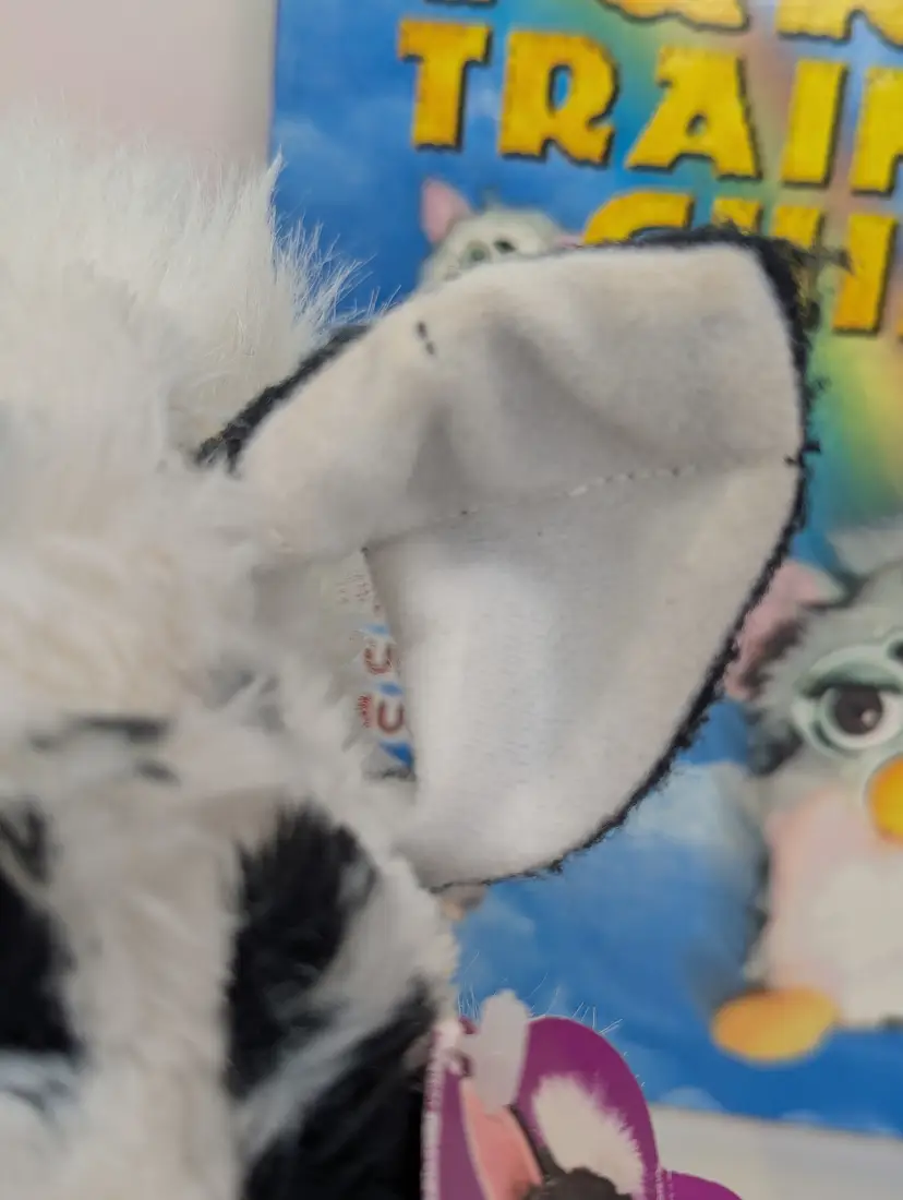 Vintage Dalmatian Furby #70-800 made by Tiger Electronics in 1998 with original Manuals and Extra Book. This furby is in White with black spots and white hair, and White feet and white/black ears. Furby is a interactive toy who will talk to other furbies, and talk when sensors are touched, moved or covered. It's battery compartment has some corrosion that was cleaned up the best i could. He takes 4 AA batteries (Not included). This furby is in good condition, he seems to have light play wear, But there is some yellowing on the eyes from age, and some stains on the bottom of the feet that I could see. No broken pieces or parts. I have also included a 1999 Furby's Trainer book! Good condition, no rips, tears or writing. Great for any furby collector! Furby's come from a smoke free, pet friendly home. They have been lightly cleaned.