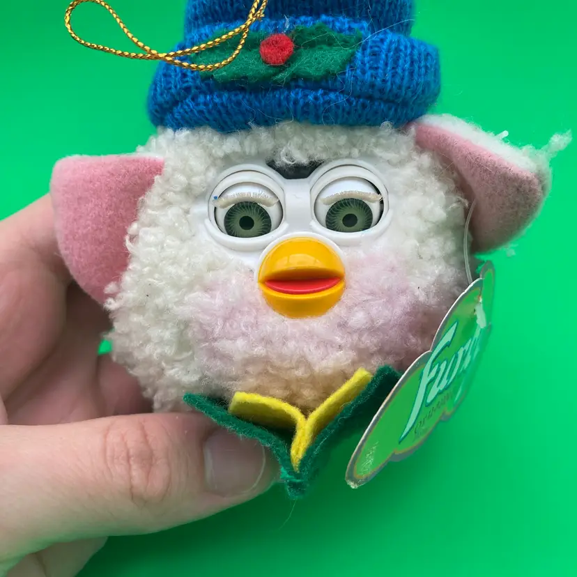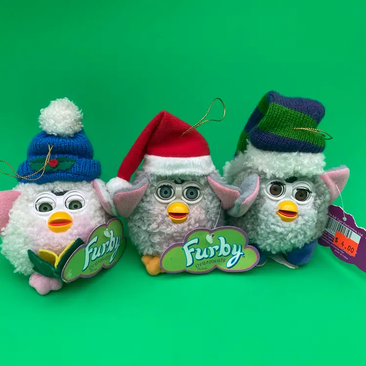 You are purchasing a lot of 3 different Furby Plush Christmas Ornaments by Tiger Electronics from 1999. All three Furbys have their original tags and tree hangers, however may need a little love and cleaning. See final 5 images for notable signs of discoloration: faint on the red hat's belly, slight on the green hat's ball of the hat, blue hat has the most, on the back of the hat, bottom, and tip of ear.