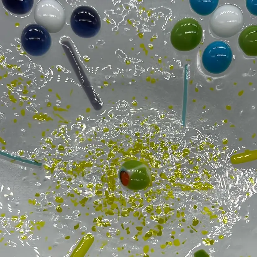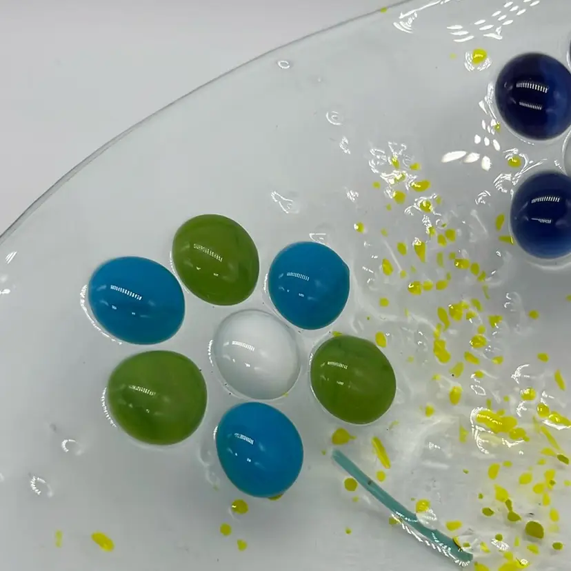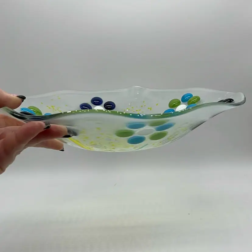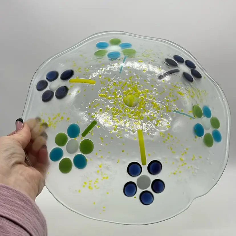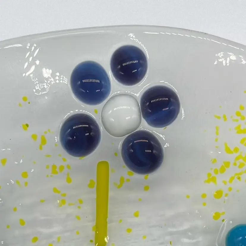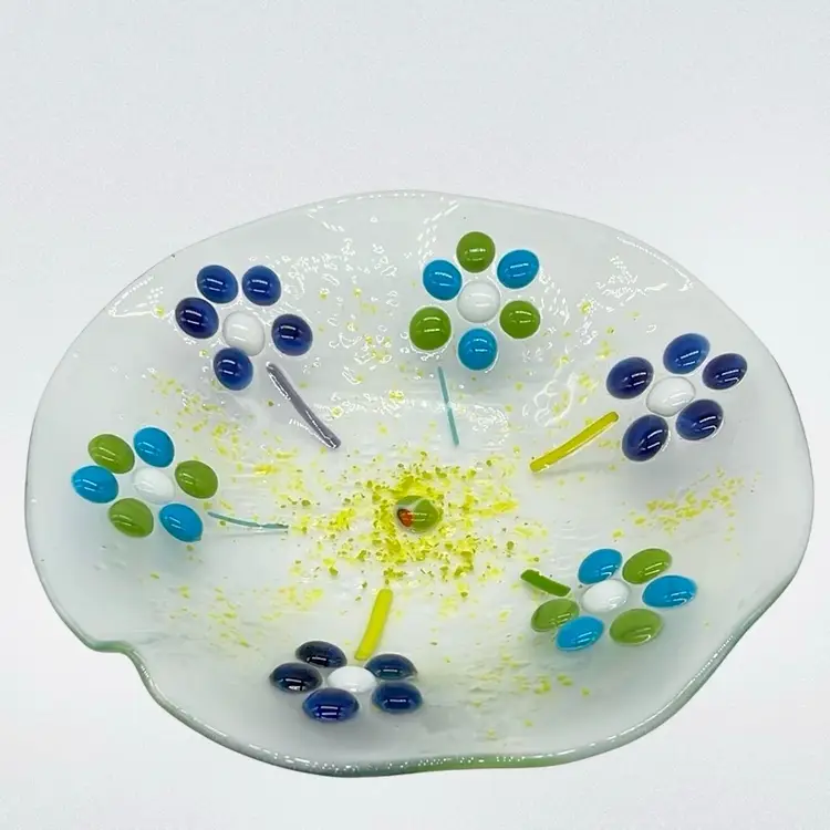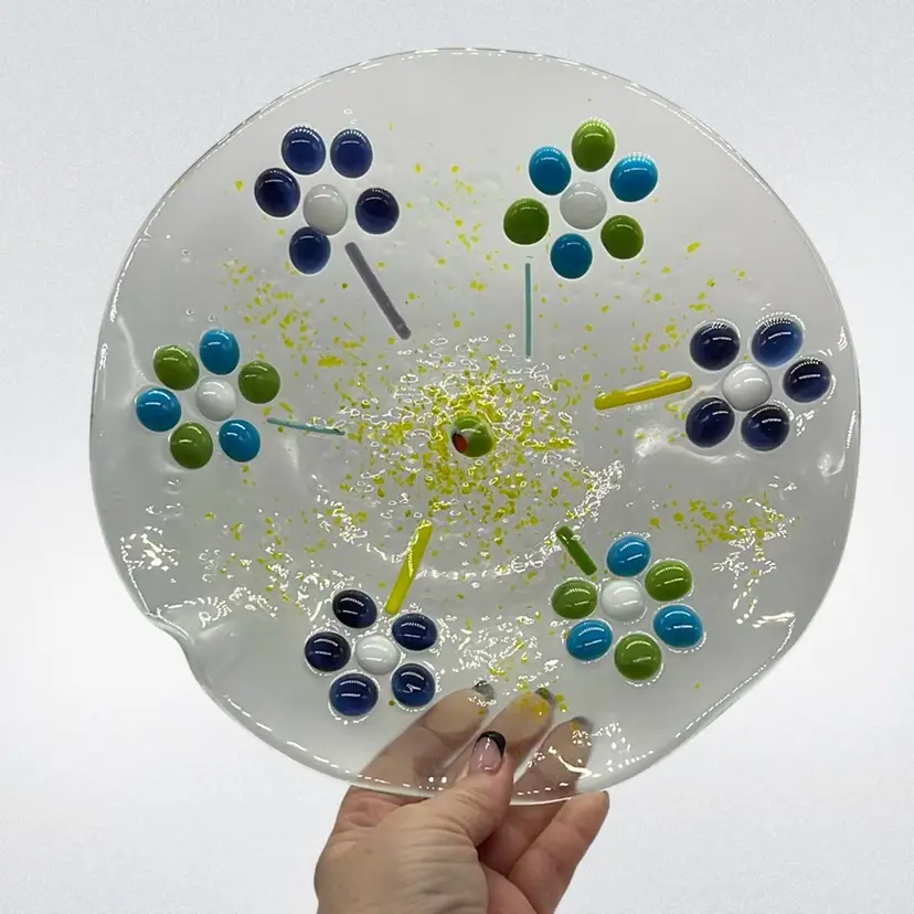Summer vibes within this fused glass dish w/ flowers! No chips or cracks. Approx: 9.75” d 1.75” h