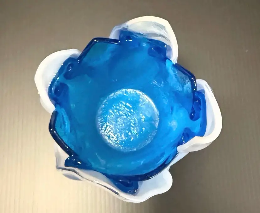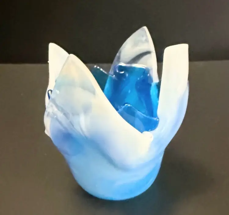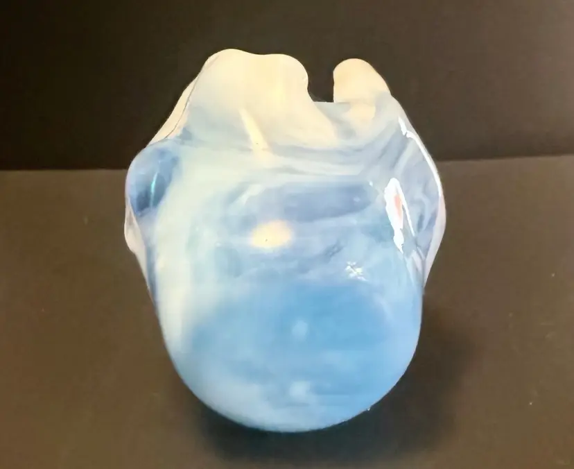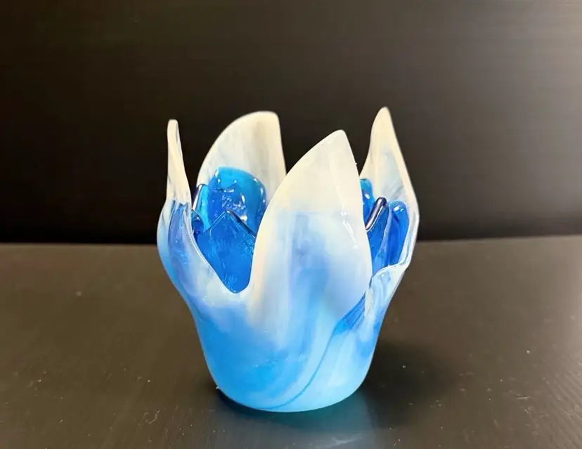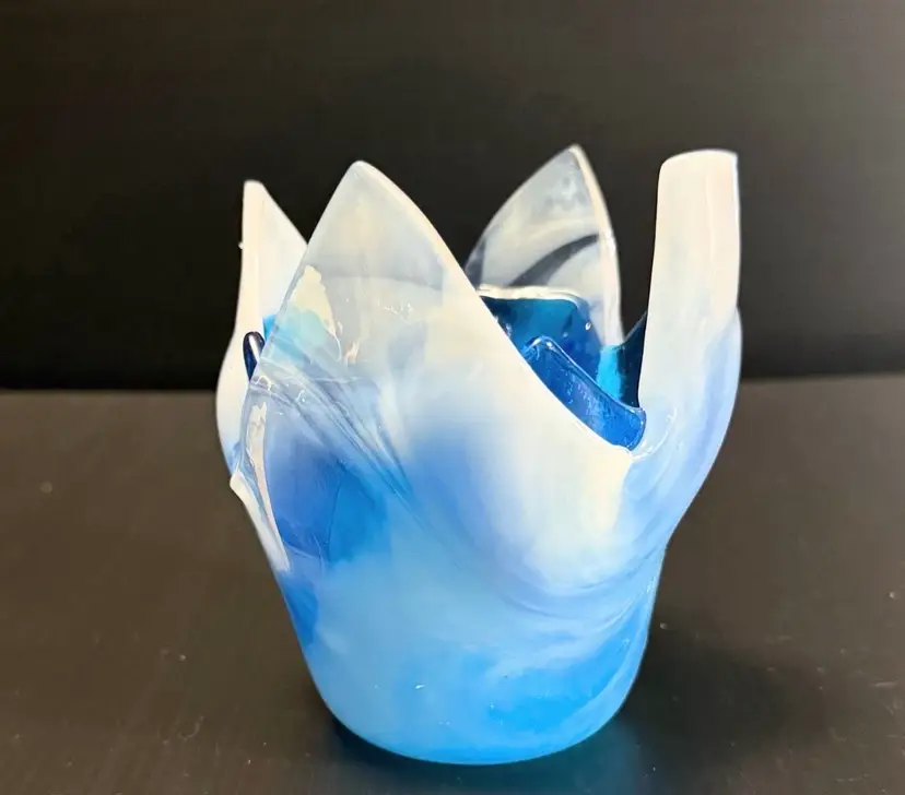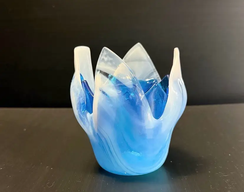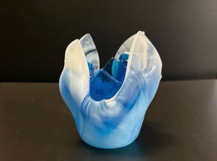 This product is a beautiful Fused Art Glass Double Handkerchief Vase / Candleholder in shades of white and blue. Handmade with a glossy finish, the contemporary style vase has a swirl pattern and a height of 4 inches. The decorative piece is an original production of art glass from the 21st century, perfect for adding a touch of abstract art to any space. The unmarked brand and unique design make it a standout piece for collectors or those looking to enhance their home decor with a one-of-a-kind item.