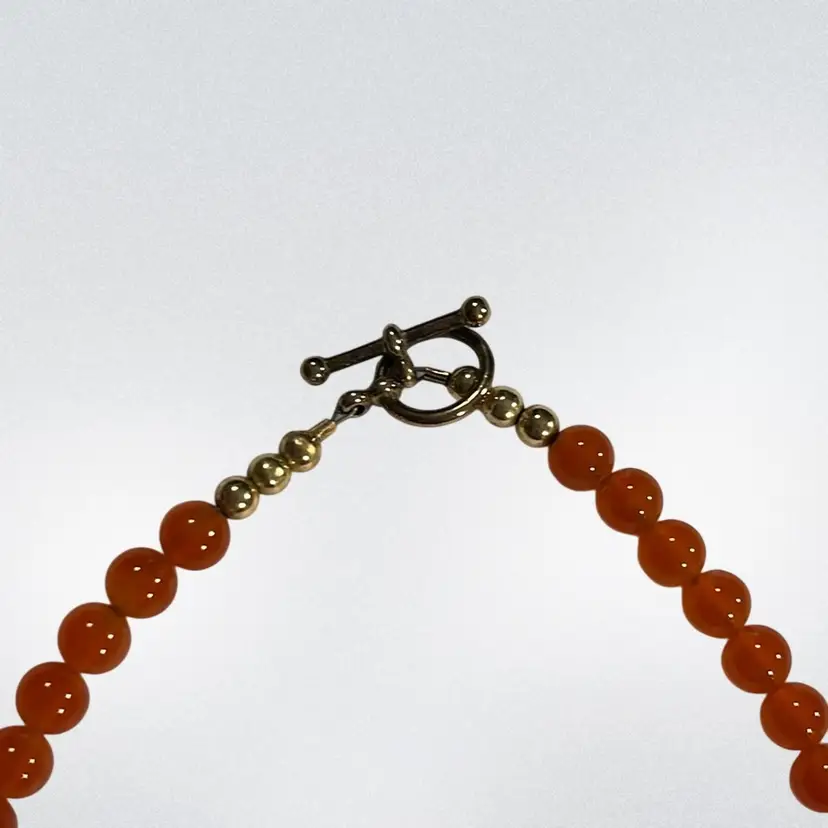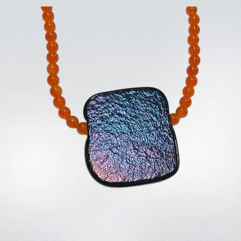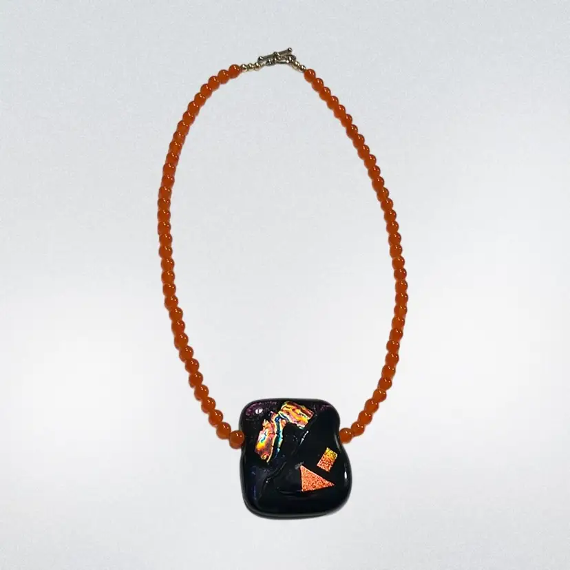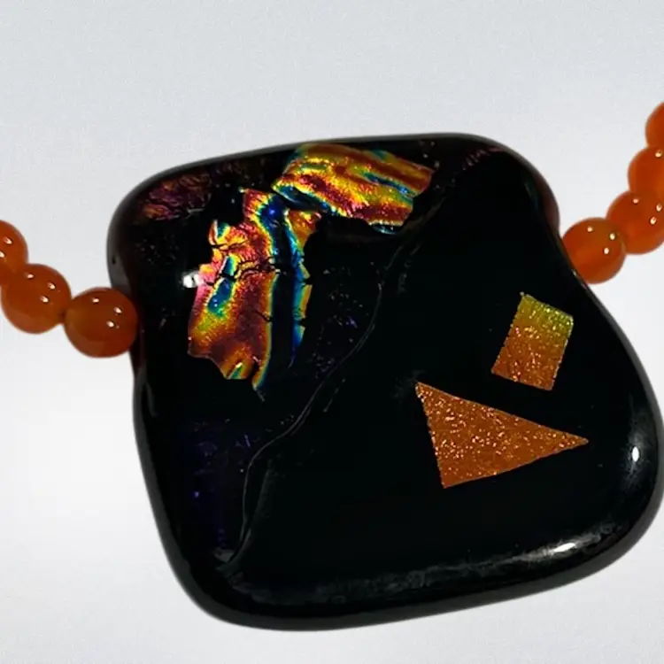 These colors are fantastic! Orange beads with black fused glass pendant with dichroic colors and abstract designs. No chips or cracks. Approx: 16” Pendant: 2”