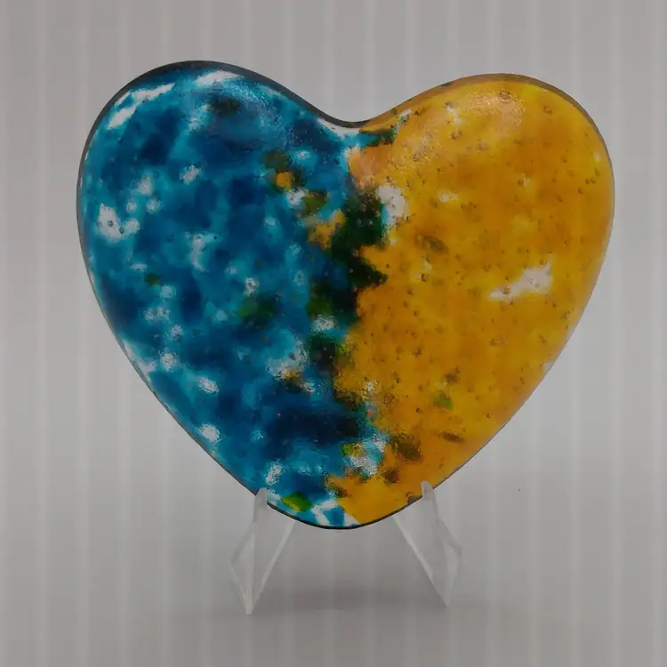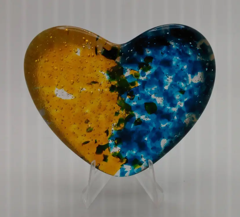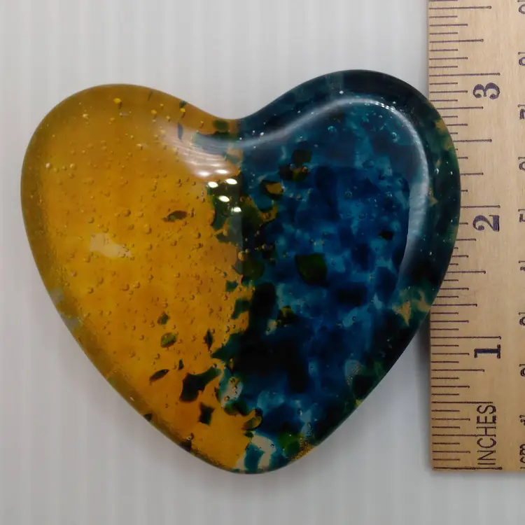 Three-inch fused glass heart paperweight, kiln made with love by me! Each heart is unique and varies in color placement, bubbles and depth of field. Shiny on the front, textured on the back, approximately 3 x 3-inches; weighs approximately 170 grams. Made with Bullseye glass - clear, marigold yellow and peacock frit throughout. Displays best with light from behind.