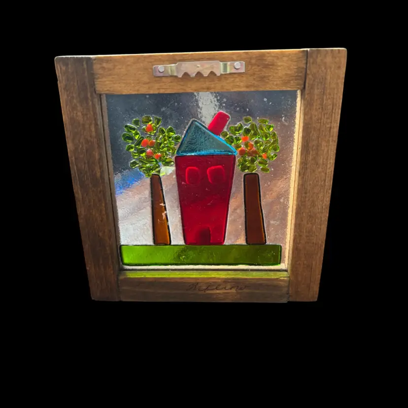 Adorable fused glass artwork in wooden frame, signed by artist. No damage. 5.25x5.5”