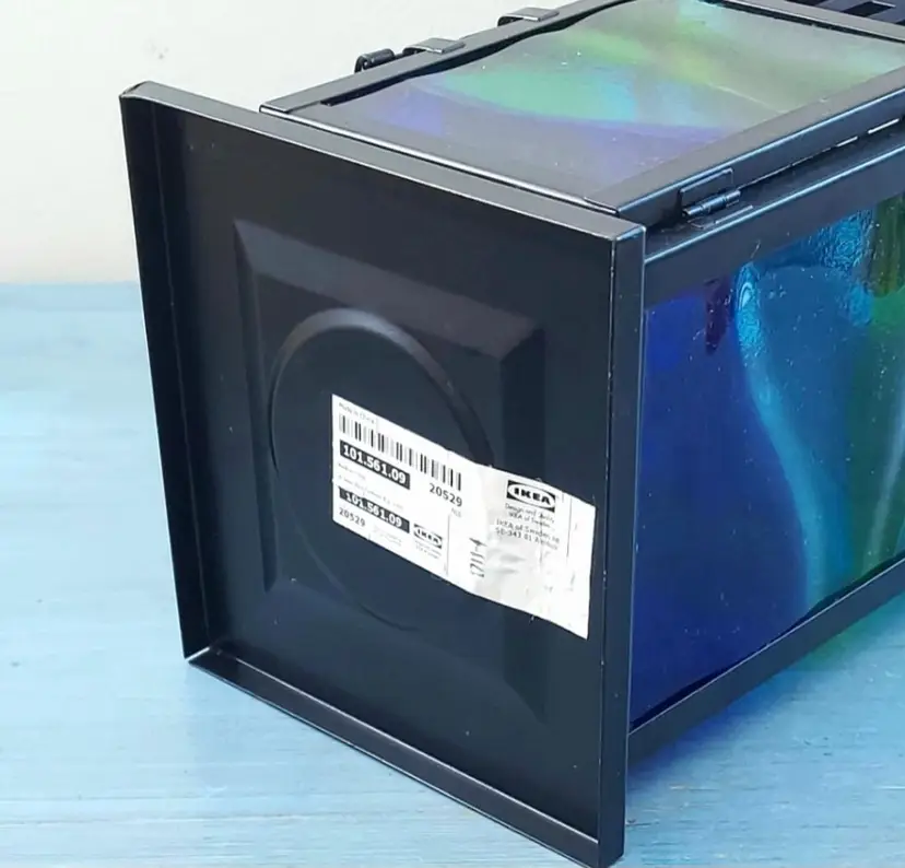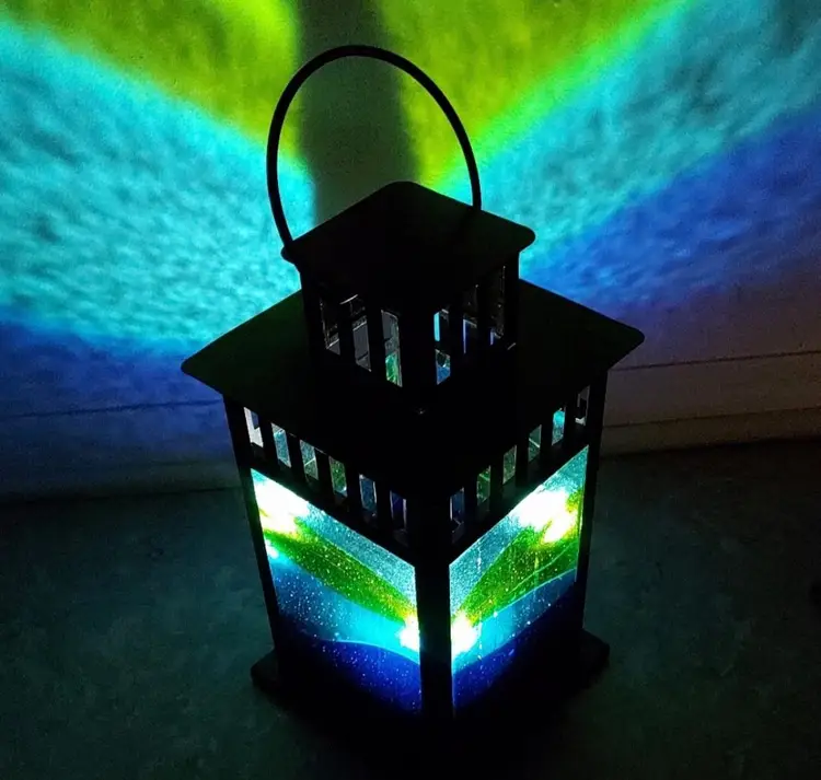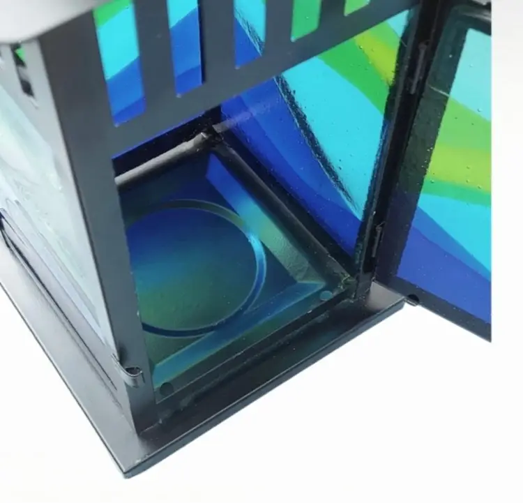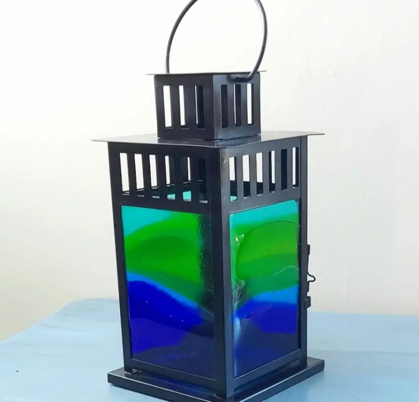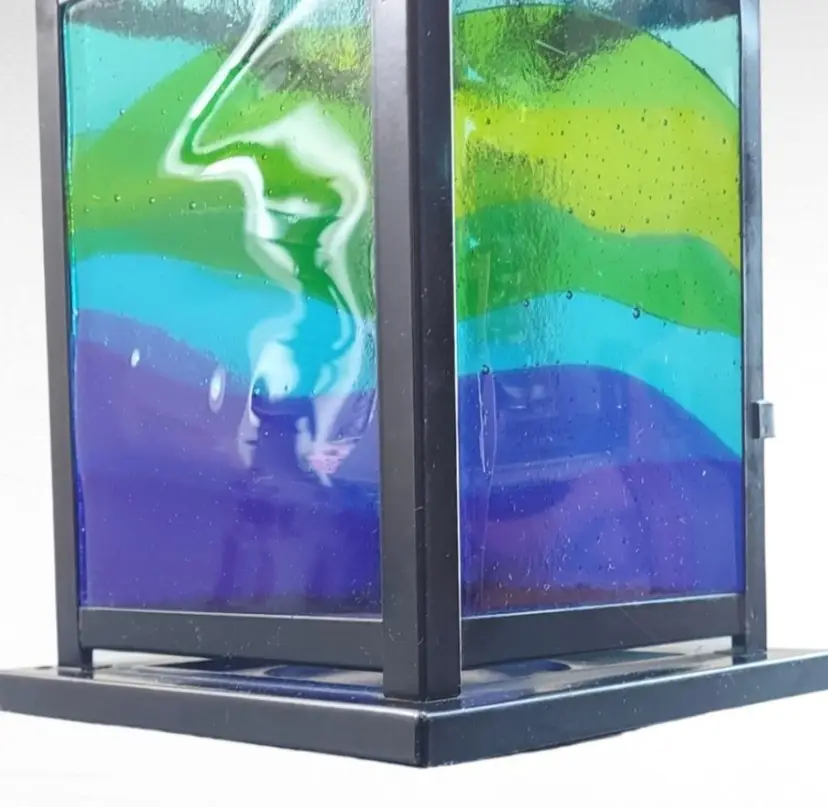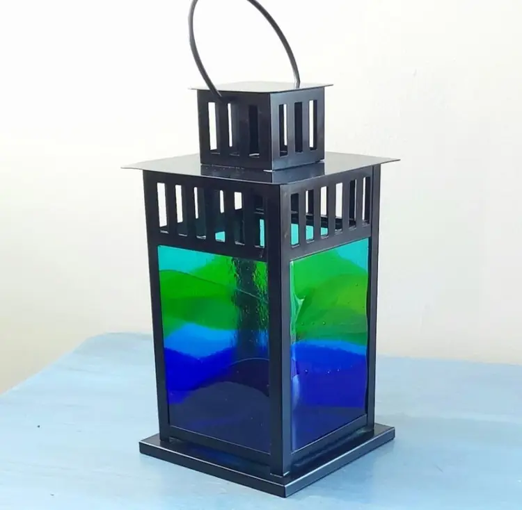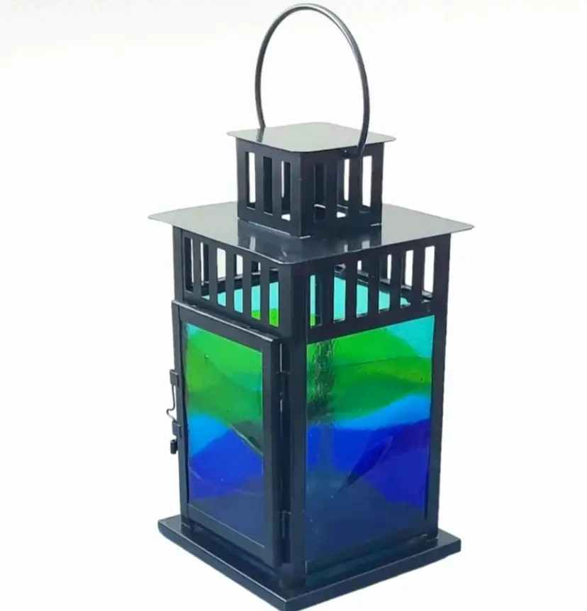 Large indoor/outdoor decorative candle lantern by IKEA. Black lantern made of steel with vibrant green, blue and purplish fused glass panels that look like the Northern Lights when illuminated can hang or sit on a tabletop would look gorgeous hanging in your garden. Excellent quality 11" tall 6" x 6" In excellent condition