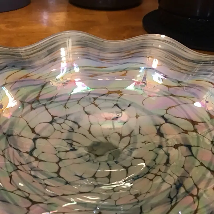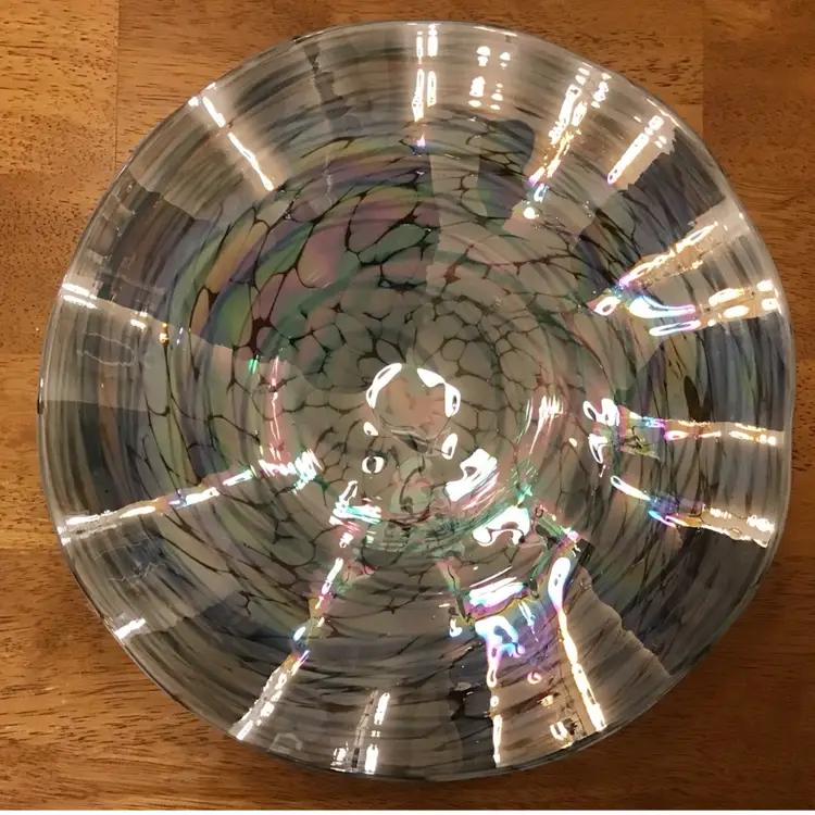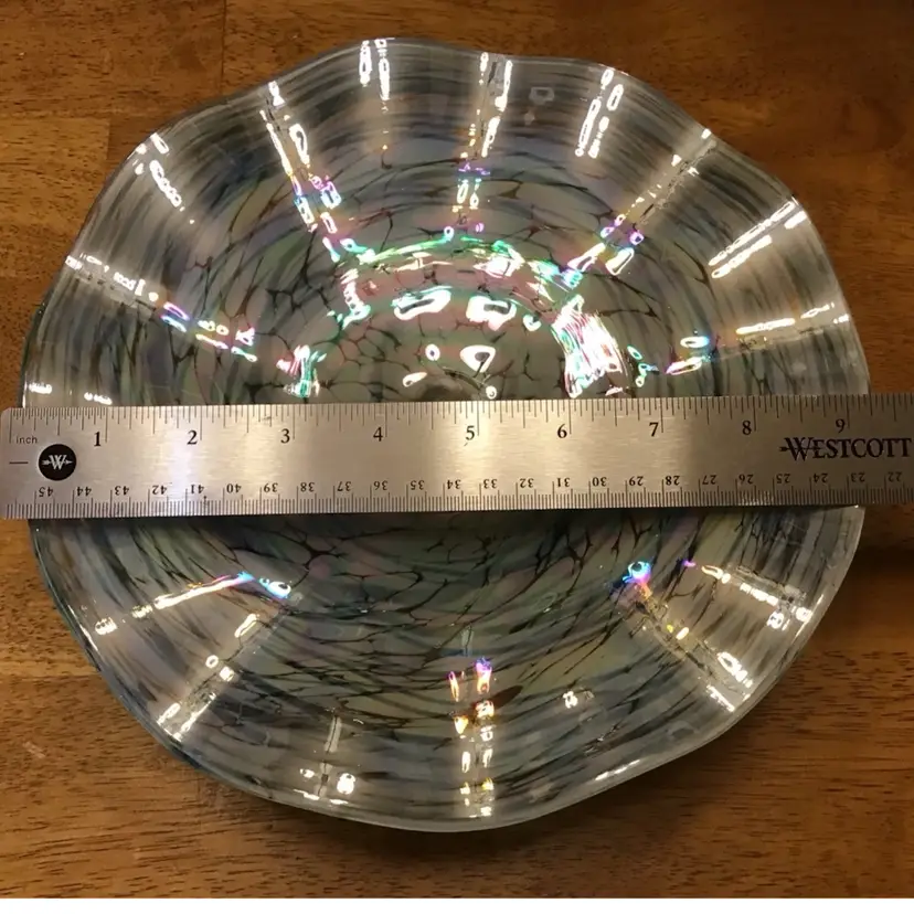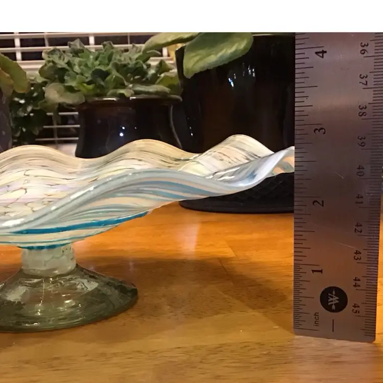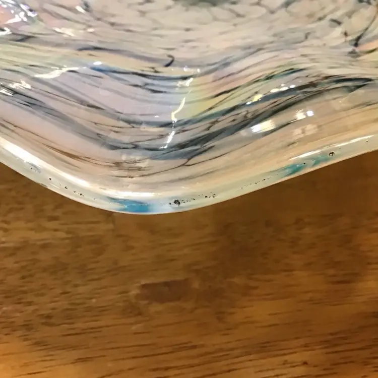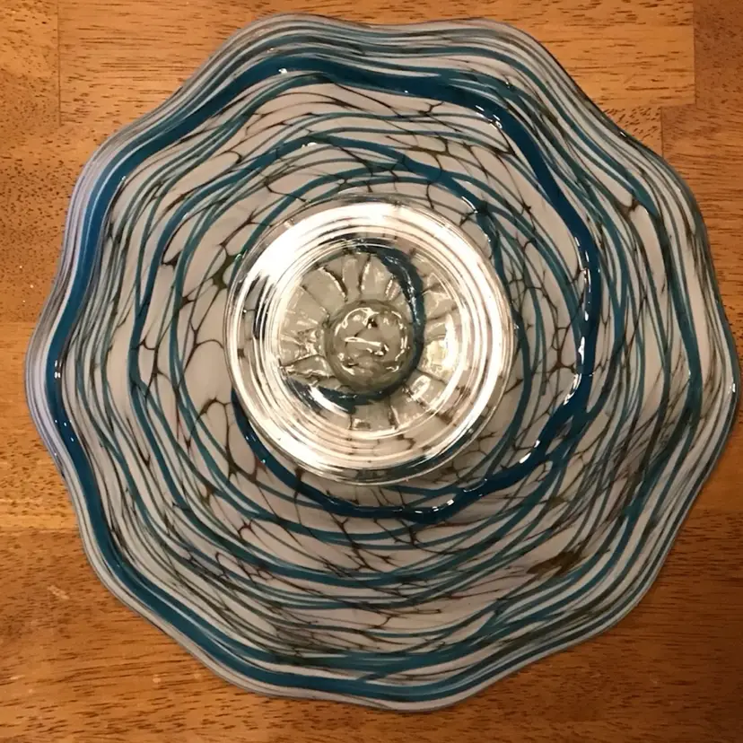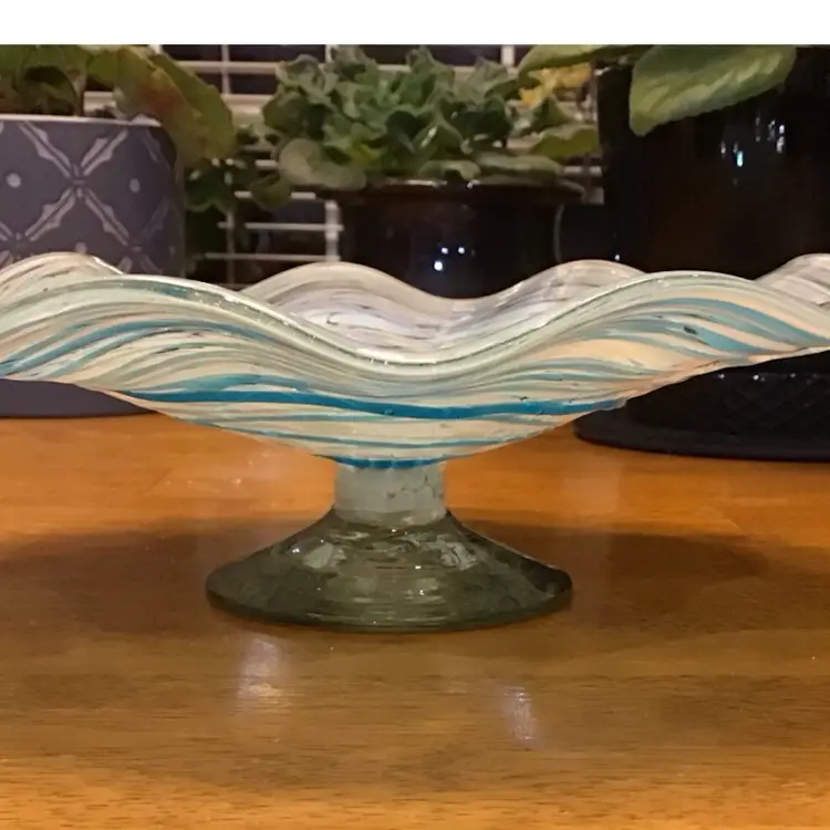 This is a beautiful dessert tray on a pedestal. It is made of fused blue, white, and clear glass. Unknown manufacturer or designer. Plate tray is in excellent condition. There is a small glass defect on one edge (shown in pictures) but no other issues. Size is in the pictures. See all pictures as they are an important part of the description.