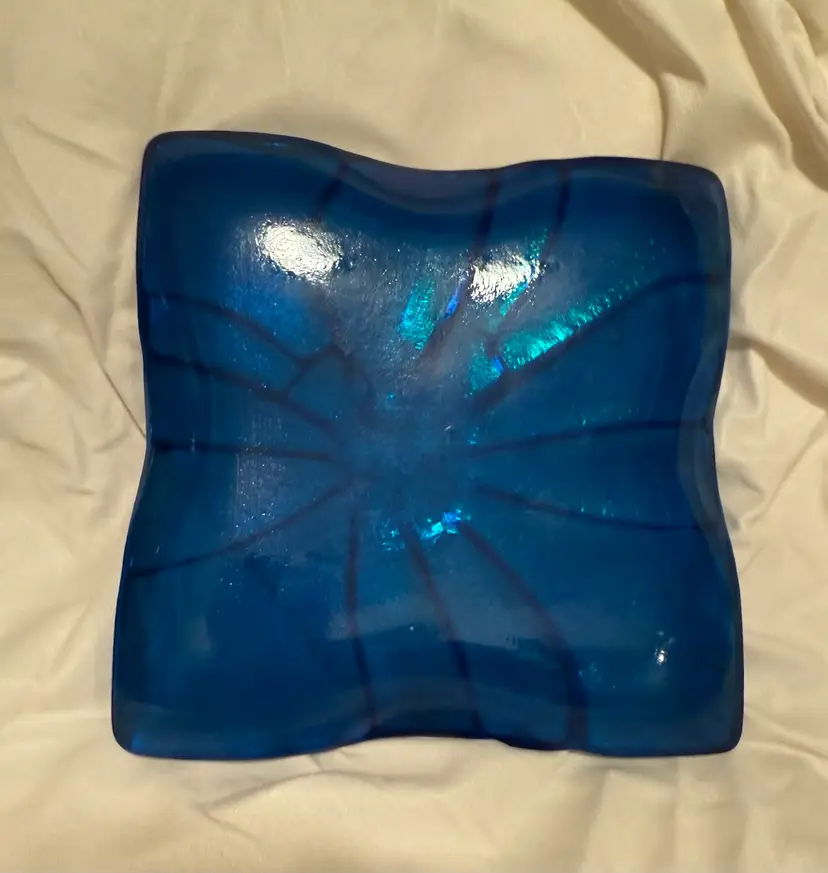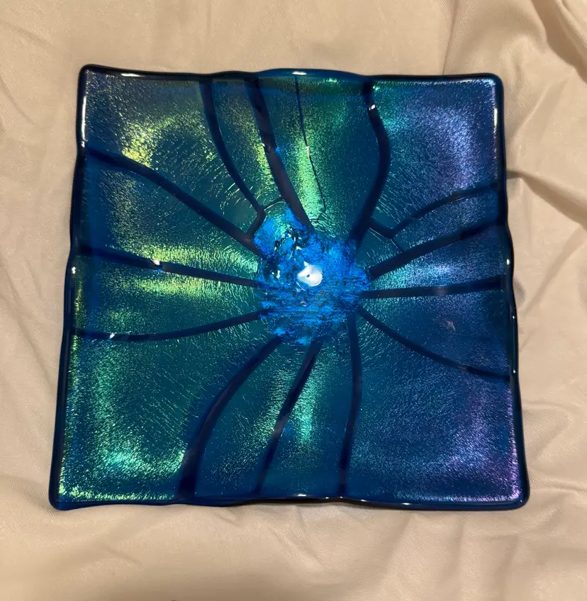 Blue iridescent fused glass dish. No chips or cracks. 7.5” X 7.5”