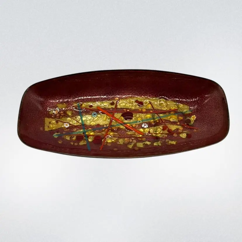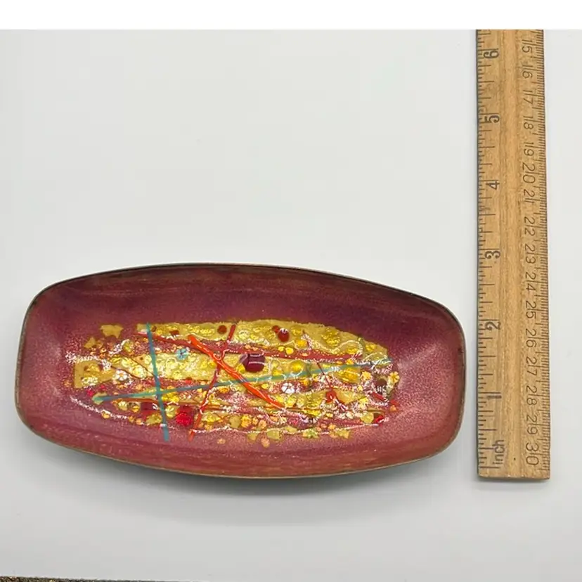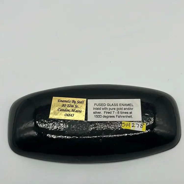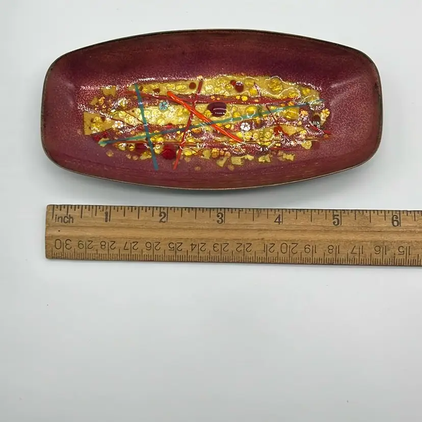 Enameled By Stell Fused Glass with beautiful abstract art and vibrant colors throughout! No flaws, good condition! Zoom in for the intricate designs! Approx: 5.75” L x 2.75” w x .75” h