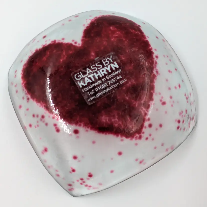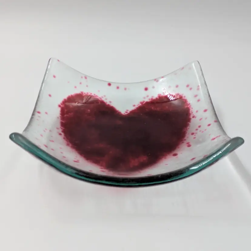 Adorable handkerchief-style trinket dish with a red fused glass design. Handmade in Scotland by Kathryn. She does a great job. No chips or cracks.